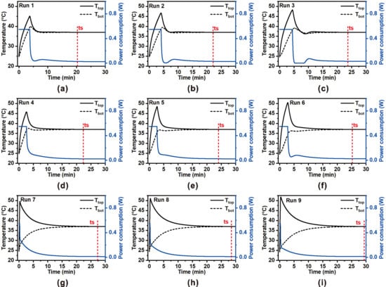Transient thermal and power responses of the ZHF thermometry probe for the nine Taguchi L9 orthogonal array runs. Each subplot (a–i) presents the top surface temperature (Ttop, solid black), skin-side temperature (Tbot, dashed black), and heater power consumption (P, blue). The red dashed line indicates the settling time (ts), defined as the moment when the temperature error (Ttop − Tbot) falls within the tolerance band of the core temperature (Tcore). The nine cases correspond to different combinations of porosity (0, 30, 90%), insulation thickness (2, 3, 4 mm), and convective heat transfer coefficient (5, 10, 15 W/m2·K), arranged according to the Taguchi orthogonal array.