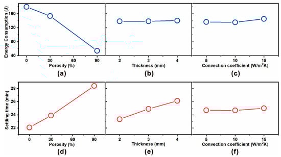 For energy consumption, porosity emerged as the dominant parameter (Figure 4a). As porosity increased from 0% to 90%, the energy consumption decreased drastically from ~170 J to ~75 J, confirming that embedding micropores within the polyethylene insulation effectively lowers the effective thermal conductivity and suppresses heat leakage. In contrast, thickness (Figure 4b) and convection coefficient (Figure 4c) had minimal influence on steady-state power demand, as also supported by ANOVA results showing <2% contribution.
