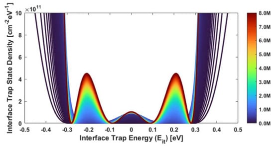 The research results from Mishima et al. [] in 2000 showed that the energy level of the Pb1 center is close to the middle of the bandgap. In 2005, Chen et al. [] measured the energy level distribution of interface traps in GLPNP and MOS devices, using GS (Gate Sweep) and SS (Sub-threshold Sweep) techniques. They found that the energy distribution of interface traps showed asymmetry. Compared with the energy below the mid-gap, the increase in Nit density is greater at energies above the mid-gap. Khoshnoud, A [] also found that density of states across the energy band exibit a non-uniform manner (Figure 8).
