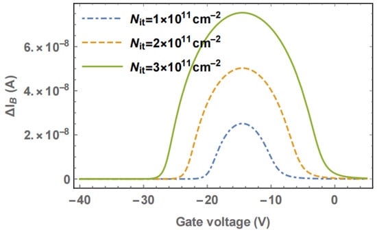 An increase in interface trap concentration raises the surface recombination velocity (SRV), thereby causing an increase in peak current amplitude, i.e., enlarging the recombination current peak. Therefore, the decrease in the current gain can be suppressed by reducing the carrier recombination rate [,]. For example, in the case of low-level injection, the relationship between SRV and Nit can be described by the following equations.