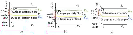 For interface traps, charge state is the most fundamental characteristic; it can be positive, neutral, or negative. Interface traps are therefore classified as donor and acceptor types. A donor interface trap is neutral when its level lies below the Fermi level (EF); if EF moves above the Fermi level, it donates an electron and becomes positively charged. An acceptor interface trap is neutral when its level lies above EF; when electrons move below the Fermi level, the e trap captures an electron and becomes negatively charged (Figure 4). For example, when voltage is applied to the gate of a MOS device, the energy level of the interface trap moves upward or downward relative to the Fermi level. When the interface trap crosses the Fermi level, its charge state will change [].