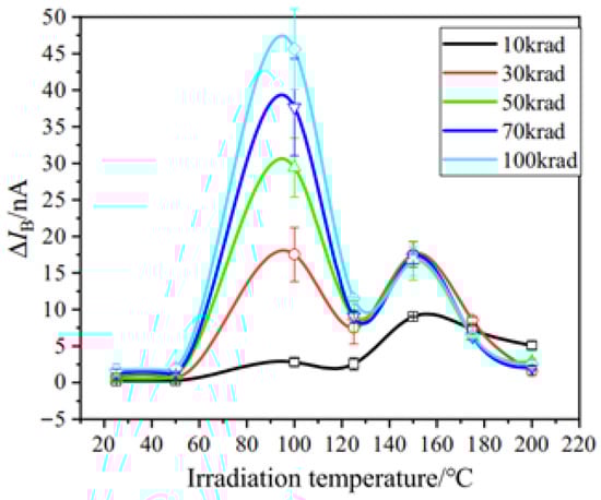 In bipolar devices, the base current reaches its peak value when concentrations of electrons and holes are nearly equal; at this point, surface carrier recombination also reaches its maximum []. In order to characterize the electron activity of interface traps, energy levels (or spectra) and effective carrier cross-sections are usually used to evaluate their impacts on device performance. These trap energy levels serve as recombination centers, which will promote electron–hole recombination. The value of capture cross-section characterizes the capture efficiency of interface traps for carriers (hole or electron). The larger the capture cross-section, the higher the probability of capturing carriers, thus an increased recombination rate.