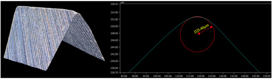 In the further part of the research, measurements of the radial run-out of the cutting tool were also carried out. A Gocator 2530 laser sensor (LMI Technologies, Burnaby, BC, Canada) was used for this purpose. A laser beam was directed perpendicular to the end mill, along its axis of rotation. The tool path was determined based on a laser-captured signal and it was then used to calculate radial run-out.