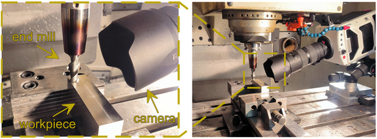 Magnesium alloys are known for their very low density and good strength-to-weight ratio. This makes them an attractive material for manufacturing components requiring the lowest possible weight. As a result, they are increasingly used in the aerospace, automotive, or military industries. However, despite these advantages they are also prone to spontaneous combustion, which poses significant difficulties in the context of machining. Magnesium dust in particular is susceptible to ignition and explosions, which is why abrasive machining of magnesium alloys is not carried out due to very large quantities of generated dust [1,2]. This means that the high quality of manufactured parts must be achieved using other machining methods. Precision milling appears to be an alternative method for increasing safety while simultaneously improving quality. Precision milling is a variant of machining in which very small values of undeformed chip thickness are removed. However, using excessively small undeformed chip thickness values lead to a phenomenon known as material ploughing. In such cases, the material is not effectively removed but instead undergoes plastic deformation. This has a detrimental effect on the machining process, as plastic deformation significantly deteriorates the condition of the machined surfaces [3,4,5]. Additionally, material deformation contributes to the formation of burrs along the edges of the machined features. These burrs also negatively affect surface quality and must be removed in a subsequent process, most often through a brushing [6] or grinding operation [7]. This necessitates additional operations, which extend the overall machining time and consequently increase the production costs. It is therefore essential to ensure the proper execution of the material removal process, which guarantees the achievement of the required machining outcomes. To make this possible, monitoring and control of the machining process are necessary [8,9]. For process observation, cameras and vision systems can be utilized.