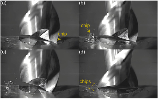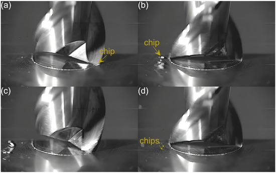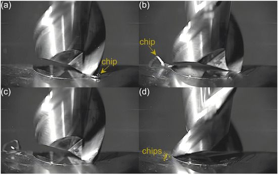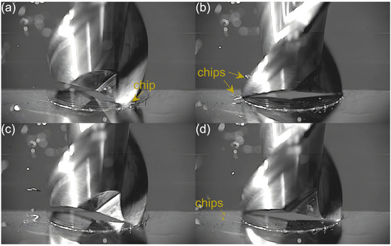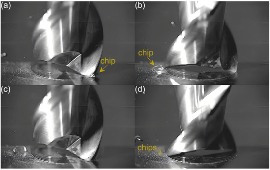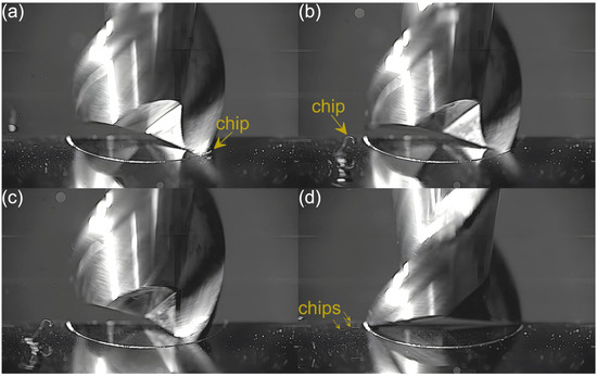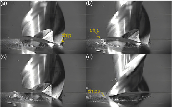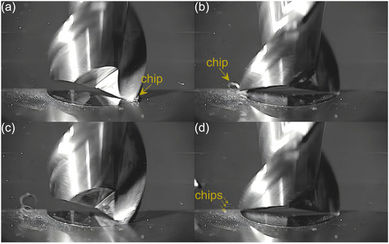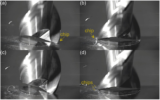 An analysis of the machining process conducted at the lowest feed per tooth reveals that the process of chip formation by the first cutting flute begins in the initial phase of performance (Figure 3a). Although the formed chip is not clearly visible due to its small size, which results from a small amount of the removed material. Moreover, the chip is also partially obscured by the burrs formed on the edges of the slot. Once the material removal by the flute is complete, the formed chip is ejected by a centrifugal force (Figure 3b). The formed chip is relatively small. Every several rotations of the tool one can observe the presence of two chips, which may be due to either chip breakage or the other chip’s formation resulting from partial removal of the accumulated burrs. As far as the other flute is concerned, no chips are formed in the initial phase of its performance (Figure 3c). However, after completing a full movement range by the flute, one can observe the presence of very fine chips or single chip fragmentation (Figure 3d). These chips differ significantly in terms of size and shape from the chip formed by the first flute.