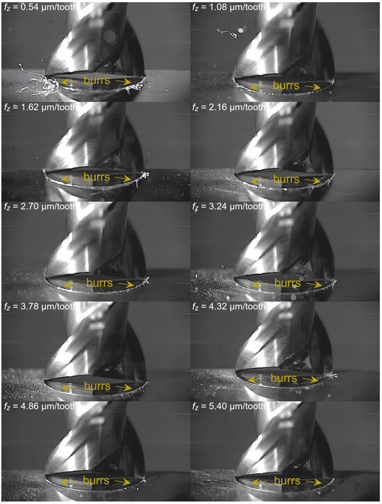 Captured images were used to extract individual frames showing different stages of cutting flutes performance. Focus was put on two phases of cutting flute performance—the initial phase when chip formation begins and the final phase when the chip formation comes to the end. The analysis was carried out for both cutting flutes separately. Material removal process as a function of the feed per tooth is shown in Figure 3, Figure 4, Figure 5, Figure 6, Figure 7, Figure 8, Figure 9, Figure 10, Figure 11 and Figure 12.