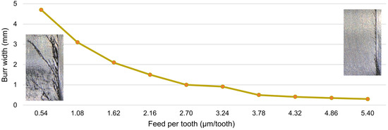 The formation of burrs on the edge of the milled slot is another important problem observed by image recording. Figure 14 presents the largest burrs formed during machining conducted with different feeds. The burrs formed along the entire length of the slot were also measured and their maximum width was determined—Figure 15. The formation of burrs is most evident when the lowest feed values are used. This is related to material ploughing resulting from the low undeformed chip thickness. When the amount of material is insufficient, the flute cannot initiate the shearing process. As a result, the material undergoes plastic deformation, which promotes the formation of burrs. Large burrs have a negative impact on the machining process and the workpiece itself. First of all, they cause deterioration of surface quality. Moreover, additional operations are required to remove them, which makes the entire machining process longer and can negatively affect manufacturing accuracy. A large number of burrs also causes the newly formed chips to become entangled in them, leading to their accumulation on the edge of the slot. This phenomenon is also undesired. Chip clusters can prevent material removal and, more importantly, cause an increase in the temperature generated in the cutting zone, which is a key aspect when machining magnesium alloys.
