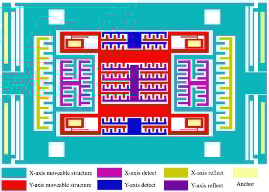 The proposed biaxial MEMS accelerometer adopts a nested dual-frame architecture, as illustrated in Figure 1, with the design objective of minimizing cross-axis coupling errors and enhancing structural utilization. In this configuration, the outer frame serves as the X-axis sensing unit, while the inner frame functions as the Y-axis sensing unit. Both frames are independently suspended and anchored to the substrate by folded beams, without any rigid connection between them. Compared with conventional single-beam decoupling or cross-beam structures, this nested layout significantly simplifies the structural design and avoids common issues such as sensitive-axis misalignment and assembly errors in packaged biaxial accelerometers.