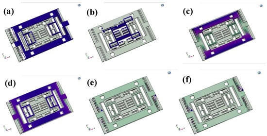 A modal analysis was first performed to investigate the undamped free vibration characteristics of the structure, thereby obtaining the natural frequencies and mode shapes of the system. The first six modes are illustrated in Figure 2. The first mode corresponds to the X-axis sensitive mode at 4149 Hz, as shown in Figure 2a, characterized by in-plane vibration of the outer frame along the compliant direction of the folded beams. The second mode represents the Y-axis sensitive mode at 7454 Hz, as shown in Figure 2b, in which the inner frame vibrates in-plane along the compliant direction of its folded beams. The higher-order modes mainly consist of torsional or bending vibrations of the outer frame, which are well separated in frequency from the sensitive modes, thereby avoiding modal interference with the sensing performance. Specifically, the third mode corresponds to an outer-frame reversal at 15,758 Hz, as shown in Figure 2c; the fourth mode corresponds to an overall lifting motion of the outer frame at 17,013 Hz, as shown in Figure 2d; and the fifth and sixth modes correspond to vibrations of the external elastic beams at 24,177 Hz and 26,446 Hz, respectively, as illustrated in Figure 2e,f.