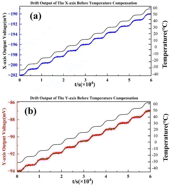 During the calibration process, the uncompensated dual-axis accelerometer was placed horizontally inside the temperature chamber and powered on at room temperature until its output stabilized. The chamber temperature was then adjusted stepwise across the designated temperature points to cover the full test range. At each temperature point, the system was allowed to stabilize for approximately 10 min, after which both the stabilized output data over a 10 min interval and the corresponding environmental temperature were recorded. The entire calibration system was computer-controlled, with data collected and stored in real time, and the temperature deviation at each measurement point was maintained within ±0.5 °C.