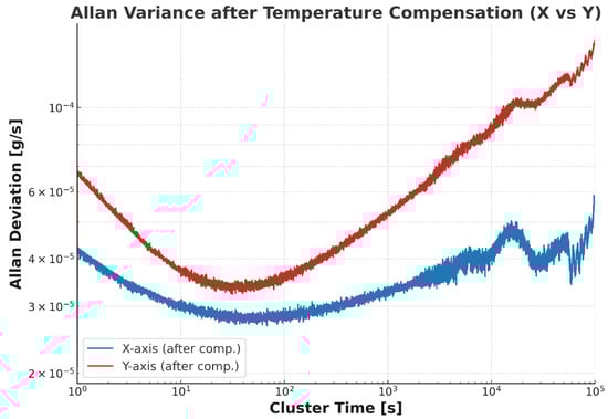 In addition, Allan variance was introduced to quantitatively analyze the compensation results. Allan variance is a standard and widely used method for evaluating the performance of inertial sensors. Figure 8 presents the Allan variance analysis of the compensation results for both the X-axis and Y-axis.