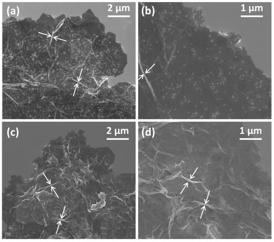 The following results analyze the composites containing 2.5 wt% of GO and nGO, which are representative samples of the synthesized composites. Figure 1 presents the morphology of the PANI-GO2.5 (Figure 1a,b) and PANI-nGO2.5 (Figure 1c,d) composites. In all the micrographs, we can observe apparently thicker GO/nGO sheets, compared to Figure S1a,b. An increase in the thickness of the sheets is evidenced by the formation of folds (indicated by arrows), this suggests that PANI forms a thin film on the GO/nGO sheets due to the amphiphilic nature of the monomer []. Furthermore, mainly in the case of the PANI-GO2.5 composite, it can be observed that part of the PANI formed particle agglomerates and adhered to the surface of the GO sheets, an effect that does not occur with nGO, most likely due to the increase in surface area that the latter presents. However, one noticeable effect that occurs with nGO is that the PANI does not coat each of the nanosheets separately but instead creates a shell that encapsulates an uncontrolled amount of them.