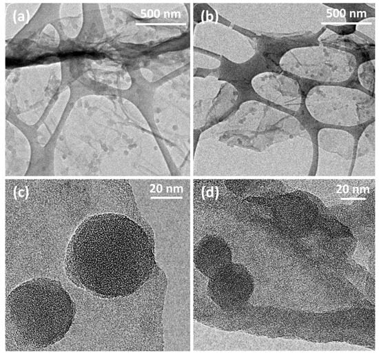 TEM micrographs of PANI-GO2.5 (Figure 2a,c) and PANI-nGO2.5 (Figure 2b,d) are shown below. From these images, we can also assume that polymerization occurs on the GO and nGO sheets (Figure 2a,b). Furthermore, in the high-resolution TEM micrographs, the sheets show greater stability to the electron beam of the equipment, confirming that thicker sheets are obtained compared to unrecovered GO. The difference in particle size of the agglomerates seen in the SEM micrographs (Figure 1) can also be observed where the PANI-GO2.5 composite presents larger particles. Similar morphology of fully coated GO sheets with polyaniline has been obtained by chemical polymerization of aniline in the presence of GO sheets [].