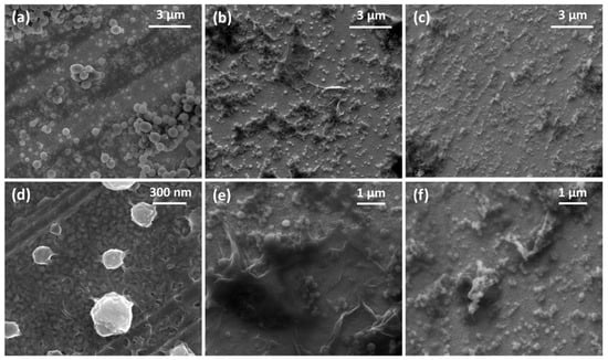 Figure 3 shows the SEM images of the films formed in situ on gold-coated quartz crystals fitted to a QCM200 Quartz Crystal balance. Figure 3a,d show the PANI film where a granular morphology with colloidal particles adhered to the surface is observed. On the other hand, Figure 3b,c show the PANI-GO2.5 and PANI-nGO2.5 films, respectively, where they are distinguished GO and nGO sheets, as well as PANI colloidal particles adhered to the graphene material. Furthermore, Figure 3d–f show a difference in size of the PANI synthesized alone and when it appears adhered to the GO and nGO sheets, where smaller adhered particles can be distinguished when nGO is used in the synthesis, as discussed in the previous morphology results.