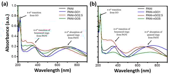 UV–Vis spectra of PANI and PANI-GO (a) and PANI-nGO (b) composites.