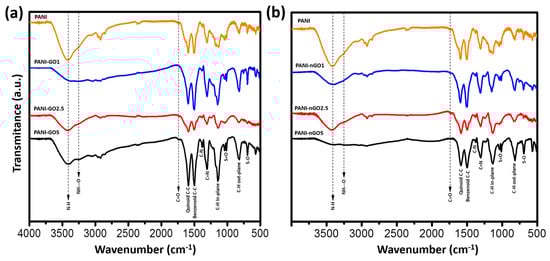 FTIR spectra of (a) PANI-GO and (b) PANI-nGO composites, compared to PANI.