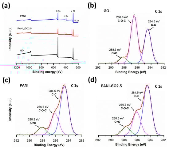 Figure 6a shows the low-resolution XPS spectra of the GO, PANI, and PANI-GO2.5 samples. It is observed that GO (black) has a carbon- and oxygen-based composition due to the photoemission peaks corresponding to O 1s around 550 eV of binding energy and C 1s between approximately 280 and 290 eV. On the other hand, PANI (blue) and PANI-GO2.5 (red) show, in addition to the C 1s and O 1s peaks, the presence of nitrogen (N 1s) and sulfur (S 2p) around 400 eV and 168 eV, respectively []. A higher amount of oxygen is evident for GO, having an O/C ratio of 0.48, as opposed to an O/C ratio of approximately 0.22 for PANI and the representative composite. The above reaffirms that PANI completely covers GO, otherwise the O/C ratio for the composites would be greater than 0.22. For a detailed analysis of the interaction between PANI and GO, the C 1s peak was deconvoluted. GO (Figure 6b) presents three signals, the first corresponds to the C 1s photoemission of C-C and C-H carbons in the sp2 state (284.6 eV), a second signal with greater intensity is observed at 286.5 eV corresponding to carbon with hydroxyl and oxygen groups (C-O-H and C-O-C), and finally, with a binding energy of 288 eV, there is a third signal corresponding to the carbonyl group C=O []. In the PANI spectrum (Figure 6c), the signals at 284.5 eV, 286.6 eV, and 288.1 eV are also identified, reported for the C-C/C-H, O-C-O/C-N, and C=O electronic environments of PANI []. The PANI-GO2.5 composite (Figure 6d) presents the same components as pure PANI, indicating that its structure is not modified and that the exposed surface of the composites is basically PANI.