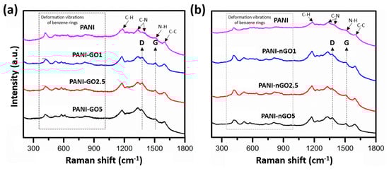 The Raman spectra of the PANI-GO/nGO composites are shown in Figure 7, with the spectrum of PANI as a reference. All spectra show bands from 400 to 1000 cm−1 related to deformation vibrations of the benzene rings, in addition to more intense bands (indicated by arrows) around 1180, 1300–1370, 1500, and 1595 cm−1, related to the C–H vibrations of aromatic rings, C-N stretching band of an aromatic amine, N–H deformation vibrations, and C-C stretching vibrations of the benzene ring, respectively [,]. On the other hand, GO is characterized by two intense peaks at 3446 and 1552 cm−1, explained by the presence of residual -OH groups and aromatic C=C stretching vibrations, respectively. However, the spectra of PANI-GO/nGO composites show a weak signal of these bands, which represents a reduction in GO during PANI polymerization [].