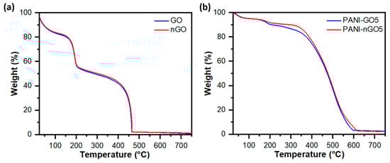 Thermogravimetric analysis of GO with large and small sheet size and their corresponding PANI hybrids are shown in Figure 8a,b, respectively. Regardless of the sheet size, both graphene oxide samples showed similar thermal behavior. The first loss around 100 °C corresponds to bound water and the second weight loss around 200 °C to GO thermal reduction. The third and final weight loss around 450 °C is the thermally reduced graphene oxide oxidation, which leaves a very low amount of ashes. On the other hand, the thermograms of the PANI and GO composites show three weight losses, the first one below 100 °C is associated with the loss of solvents or moisture absorbed in the sample; the second loss is found between 200 and 300 °C, associated with the functional groups present in GO/nGO; the last and third weight loss is found around 400 and 600 °C, because the polymer begins to thermally degrade [].