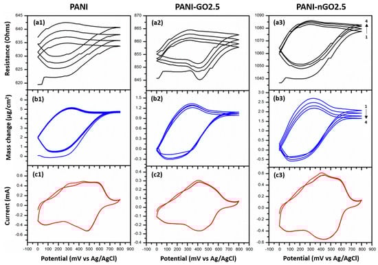 During the polymerizations, we noticed that a thin conformal film of PANI and GO was also obtained (Figure 3). We deposited these films in gold-coated quartz-crystal and studied these films by combining cyclic voltammetry and microbalance measurements; the results are presented in Figure 9. The behavior of PANI, PANI-GO2.5, and PANI-nGO2.5 composites presents similarity, which is discussed below. The changes in resistance (Figure 9(a1–a3)) are due to changes in the energy dissipation of the quartz crystal [,], mainly due to changes in the damping capacity of the deposited film, which in turn result from changes in its mechanical properties. This change in the resistance of the quartz crystal is consistent with the mass changes (Figure 9(b1–b3)); both curves present the same shapes, indicating that there is no significant change in the elastic properties of the films during the test. Furthermore, the films show two broad oxidation peaks around 300 mV and 500 mV during anodic scanning (Figure 9(c1–c3)), indicating transitions between different oxidation states of PANI, specifically, from leucoemeraldine to emeraldine and from emeraldine to pernigraniline []. The respective reductions are shown during cathodic scanning, indicating that the oxidation is reversible. During potential scanning, the polymer becomes dedoped during the leucoemeraldine stage, reflecting a mass loss with a frequency shift (Figure 9(b1)) corresponding to a mass amount of around 4 µg/cm2 for PANI and higher for the composites (Figure 9(b2,b3)), due to the loss and absorption of chlorine anions during the doping–redoping process [].