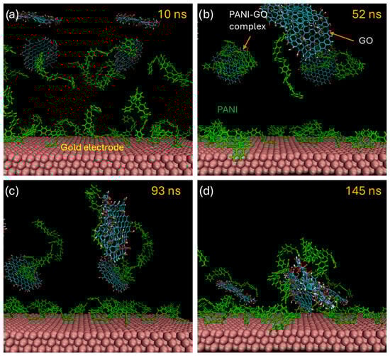 The mechanism of film growth was studied with the help of molecular dynamics simulations and selected frames of a simulation are shown sequentially in Figure 10. At the beginning of the simulation, the GO sheets were solvated with water molecules, while the PANI octamers rapidly adsorbed onto the gold electrode surface. These short PANI chains represent oligomers that act as nuclei for the subsequent formation of PANI precipitates. After approximately 15 ns, the PANI molecules flattened against the electrode, indicating strong interactions with the surface. The GO sheets occasionally interacted with each other through hydrogen bonding []; however, these contacts were weak and did not lead to irreversible aggregation. In contrast, when the PANI films interacted with the GO sheets, they established both hydrogen bonds and π–π stacking interactions between the aromatic rings of PANI and the sp2-rich regions of GO (Figure 10b). These interactions resulted in the irreversible formation of PANI–GO aggregates with reduced solubility. Once the PANI-GO complexes formed, the PANI molecules progressively dragged the GO sheets toward the electrode, acting as binding elements that promoted the deposition of the PANI–GO complexes onto the surface (Figure 10c,d) []. These simulations therefore support a mechanism of composite film formation driven by the binding ability of PANI, since GO is highly hydrophilic and alone exhibits low affinity for the gold electrode.