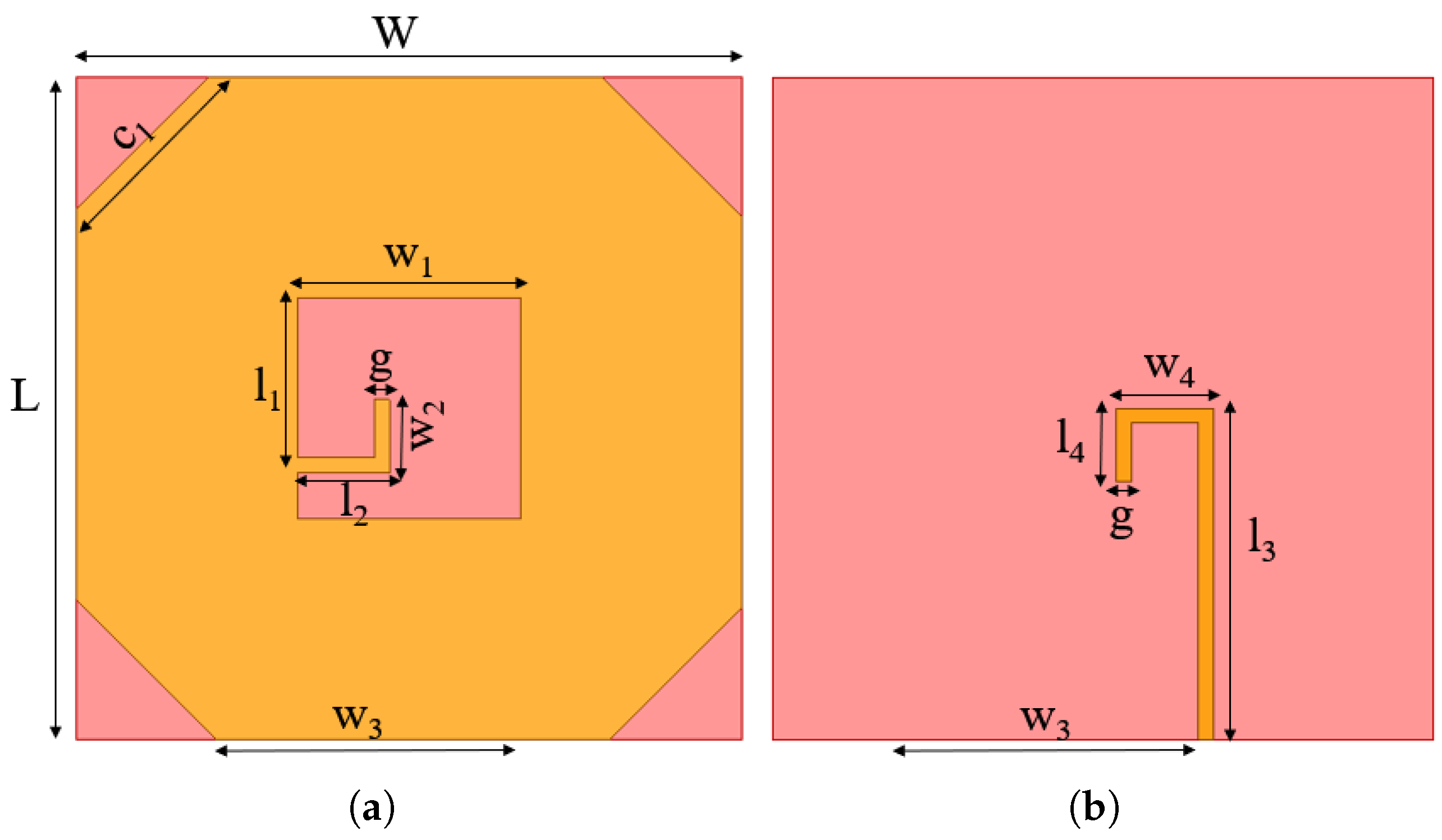 Initially, the Ant-I was fed by a conventional 50 Ω microstrip line (MSL) of length l 3 . To excite circular polarization (CP), the feeding structure was modified by extending an inverted L-strip from the MSL. The MSL, along with the inverted L-strip, was offset by 7 mm from the slot’s center, towards its right edge, in Ant-II to perturb the field distribution. While this perturbation successfully excited orthogonal degenerate modes, evidenced by a significant drop in the axial ratio (AR) from 60 dB to 10 dB, to achieve robust CP operation, a second L-shaped stub was introduced from the left side of the slot in Ant-III. This final modification creates the necessary asymmetric perturbation within the resonant cavity, unbalancing the electric field to produce two orthogonal modes with a 90° phase shift, thereby realizing a functional CP wave. A final design Ant-IV optimization involved chamfering the four corners of the ITO radiator as shown in Figure 2. This improvement is attributed to the dual effect of the chamfers resulting enhanced gain through surface wave suppression and, thereby improving the phase balance between orthogonal modes over a wider frequency range that results in an enhanced axial ratio bandwidth. The final chamfering in Ant-IV further optimized the current path length, which can be quantified by the phase constant ( β ). The improved phase balance ( Δ Φ ) across the bandwidth is given by (1)