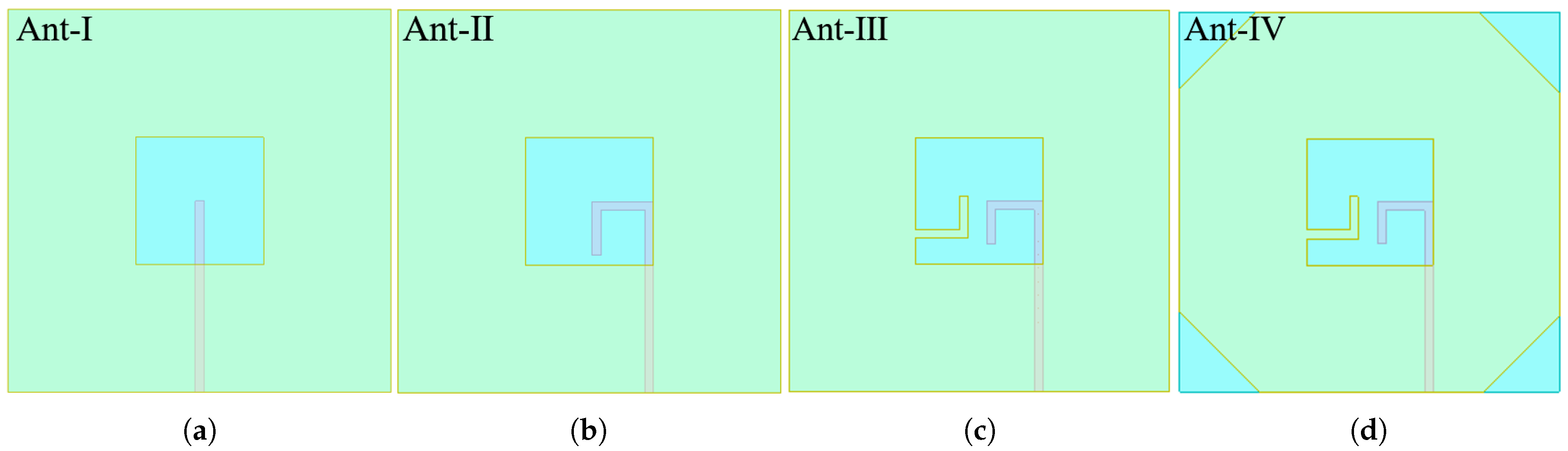 Figure 2. Antenna evolution steps, Ant-I to Ant-IV: (a) Ant-I, (b) Ant-II, (c) Ant-III, (d) Ant-IV.