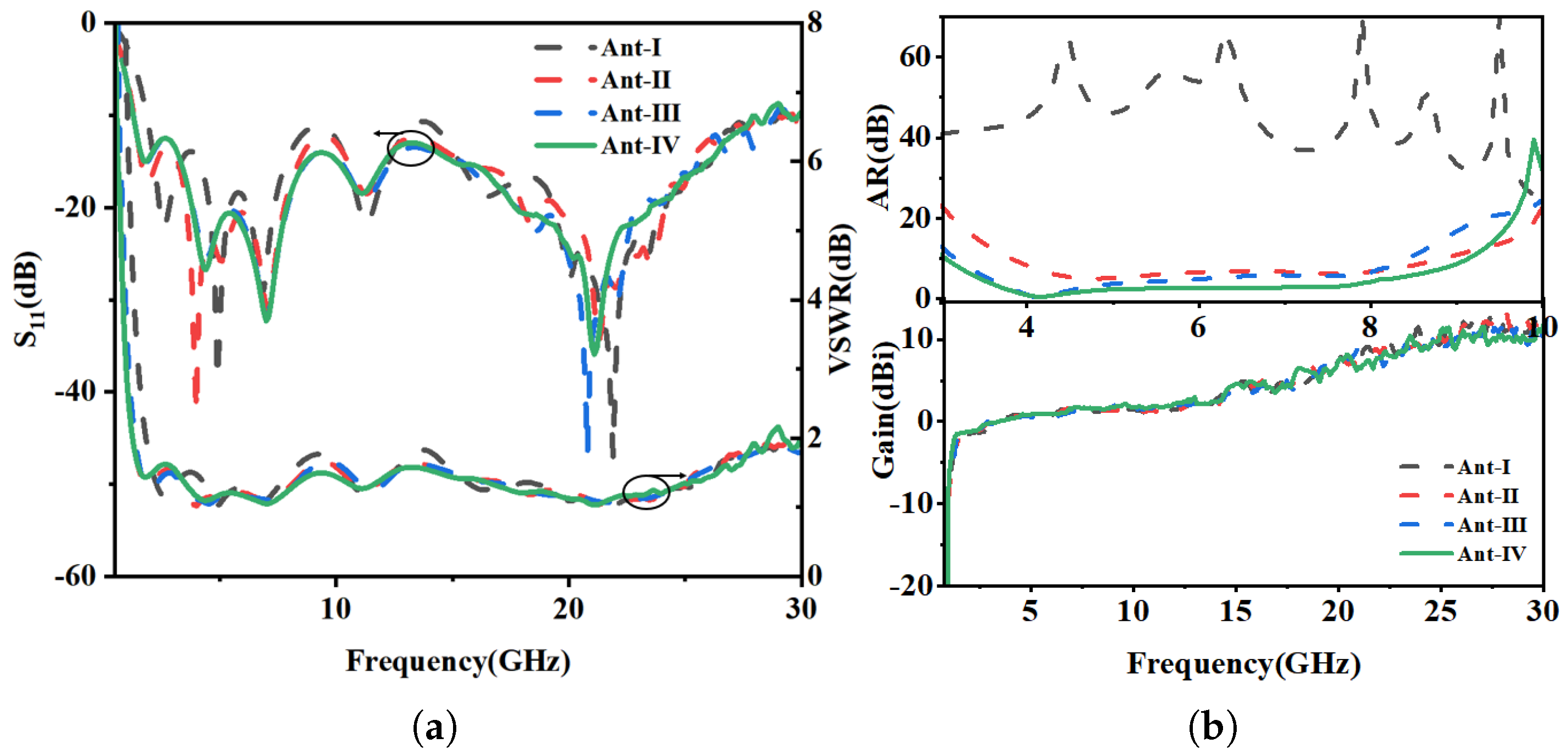 Figure 3. Simulation results of antenna evolution for Ant-I to Ant-IV. (a) Return loss and VSWR. (b) Axial ratio and peak gain.