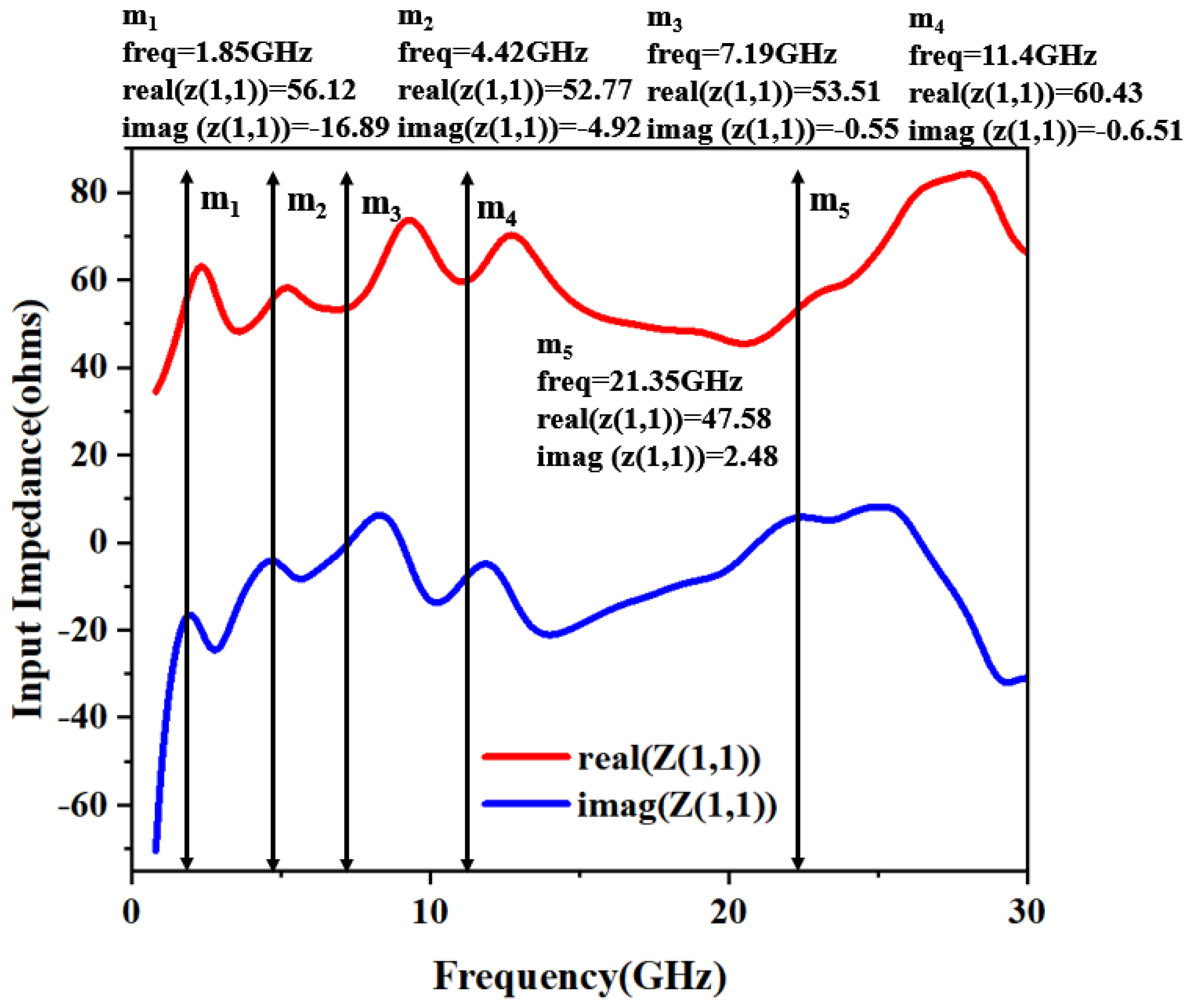 The equivalent circuit model of the designed antenna is implemented using the Advanced Design System (ADS), as illustrated in Figure 4. The model was derived from the reflection coefficient (S11) response, where each resonance (identified by an attenuation dip below 10 dB) is represented by a parallel RLC circuit. Five distinct resonant modes are modeled within the operational band from 1.33 to 28.52 GHz. Markers m1 to m5 in Figure 4 denote these resonant frequencies. At these points, the input impedance has a real part close to 50 Ω and an imaginary part near 0 Ω , confirming excellent impedance matching.