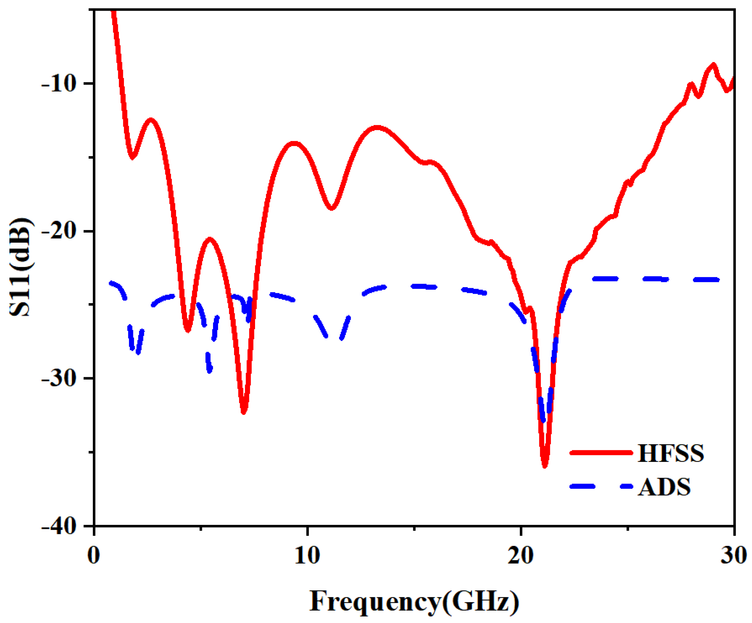 Figure 6. Comparison of reflection coefficient obtained from HFSS and ADS.