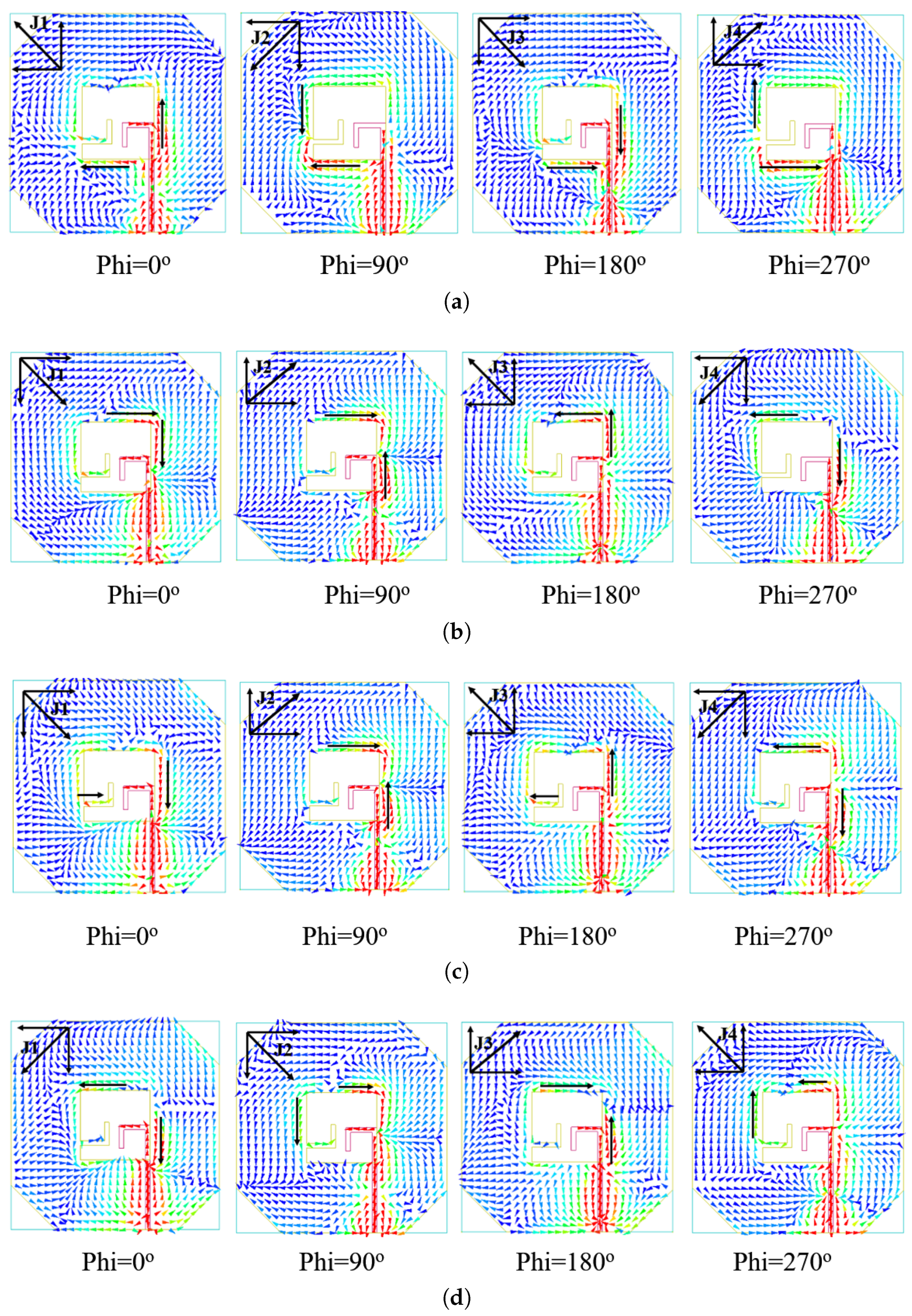 Figure 7 illustrates the principle of circular polarization through simulated surface current distributions at distinct time phases (0°, 90°, 180°, 270°) for frequencies of 4.3, 5.8, 6.5, and 7 GHz. The sequence at 4.3 GHz demonstrates a clear counterclockwise rotation of the dominant current vector. Initially, at ω t = 0°, the current flows primarily along the +Y and −X axes, forming vector J1. Later, at ω t = 90°, the current shifts to the −X and −Y axes, forming vector J2. Furthermore, at ω t = 180°, it aligns with the −Y and +X axes, forming vector J3. Finally, at ω t = 270°, the current flows along the +X and +Y axes, forming vector J4. This sequential, counterclockwise rotation of the current vector observed from the +z direction confirms the generation of a right-hand circular polarization (RHCP) wave. This characteristic rotational behavior is consistently observed across the antenna’s operational bandwidth.