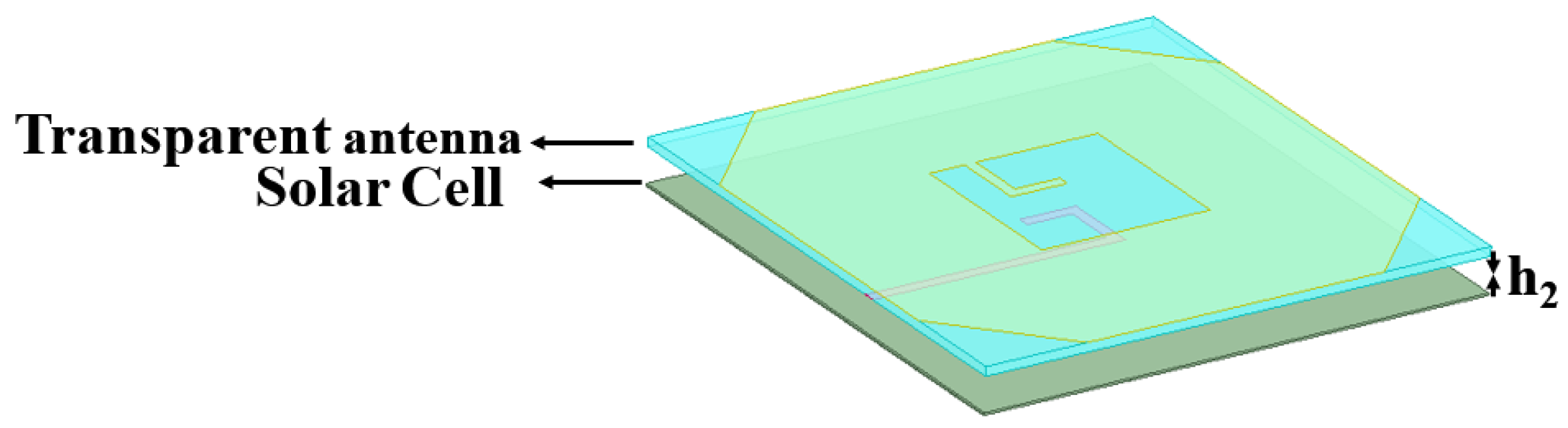 The effect of integrating a solar cell on antenna performance was investigated. A cell with a thickness of 0.2 mm ( ε r = 1.5, µ = 1) was placed beneath the transparent antenna, and its vertical position was varied at heights of h2 = 1 mm, 2 mm, and 3 mm. A schematic of the solar cell integrated beneath the transparent antenna (TA) is provided in Figure 8. The superior optical transparency of transparent antennas (TAs) over conventional grid and mesh structures maximizes light incidence on the underlying solar cell, thereby minimizing the shadow effect and facilitating optimal solar conversion efficiency. Figure 9 compares and analyzes the return loss (S11), VSWR, axial ratio (AR), and gain characteristics of the antenna and the solar cell at different separation heights.