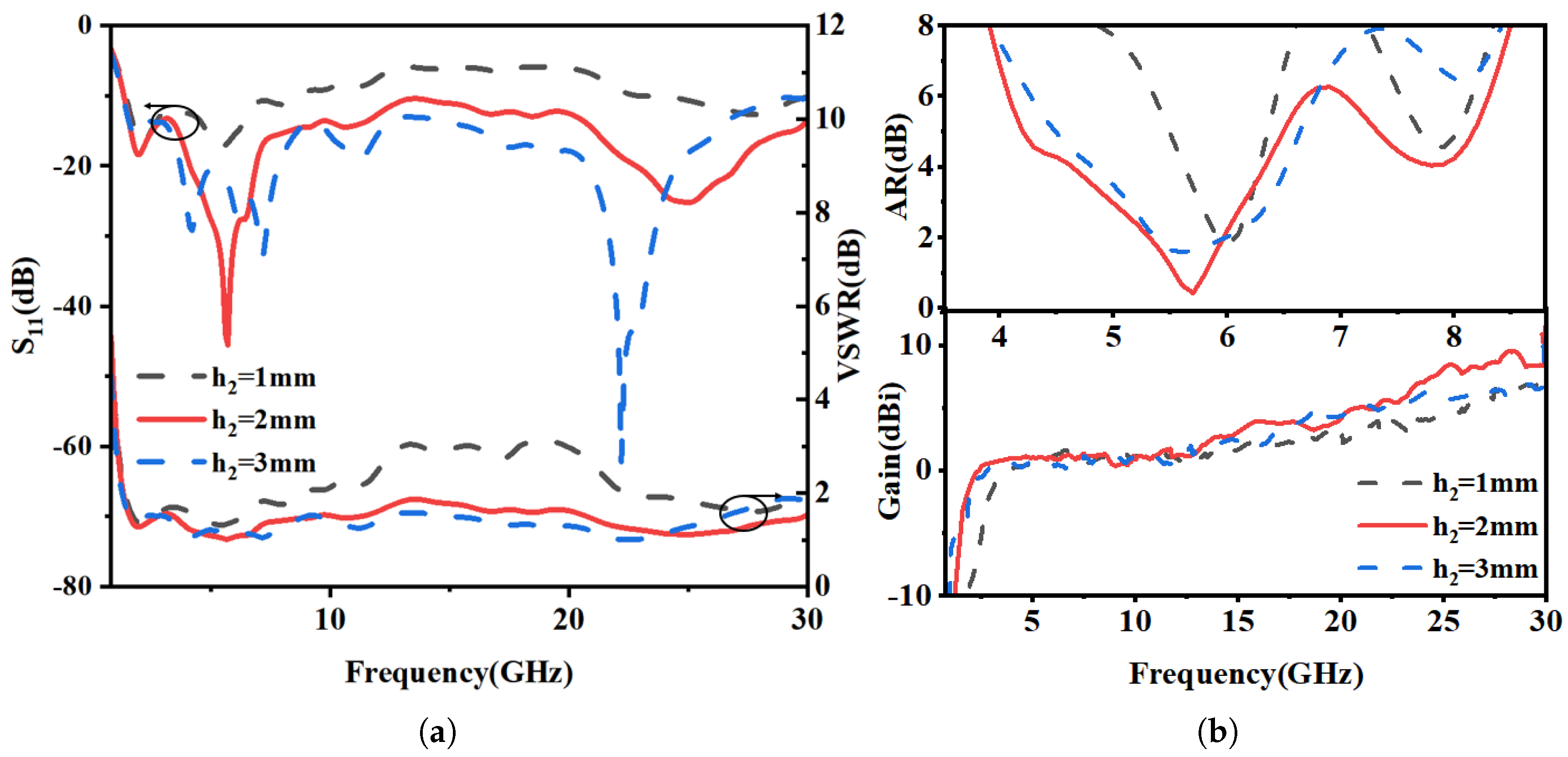 Figure 9. Antenna performance with solar cell at various separation distances (h2). (a) Return loss and VSWR. (b) Axial ratio and peak gain.