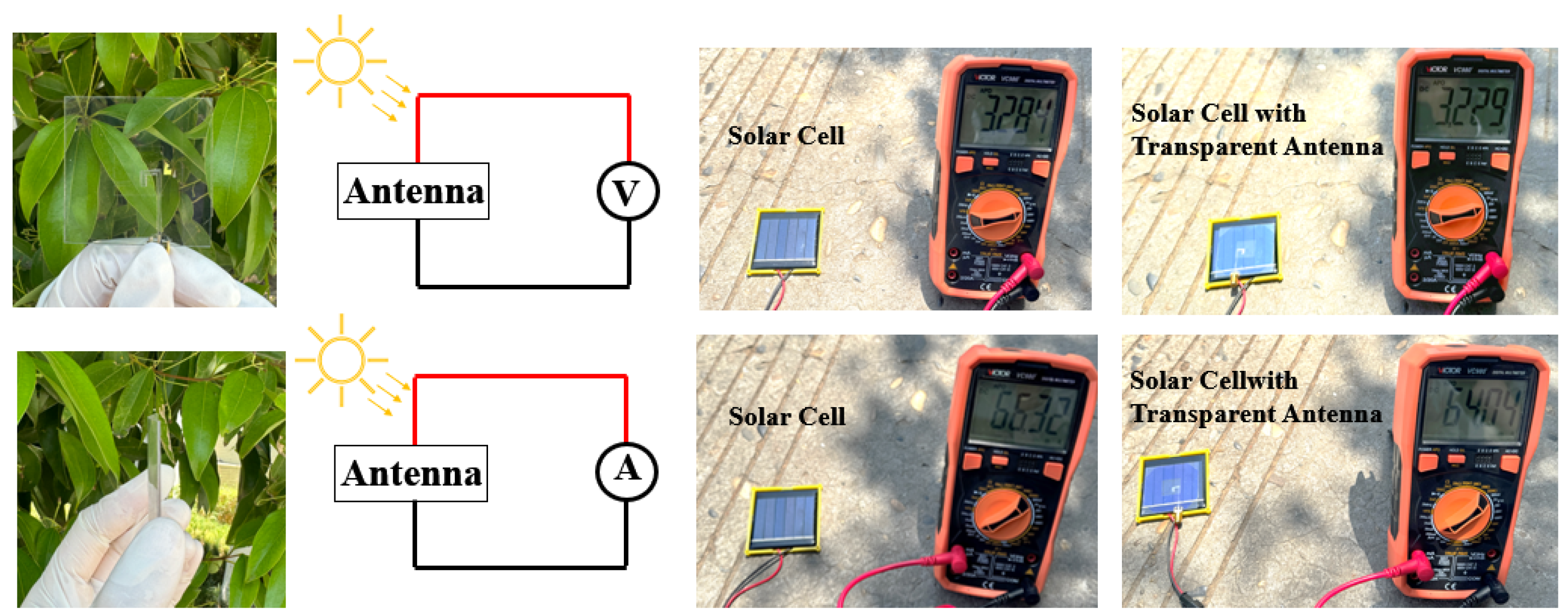Figure 10. Transparent antenna prototype and its influence on solar cell output.