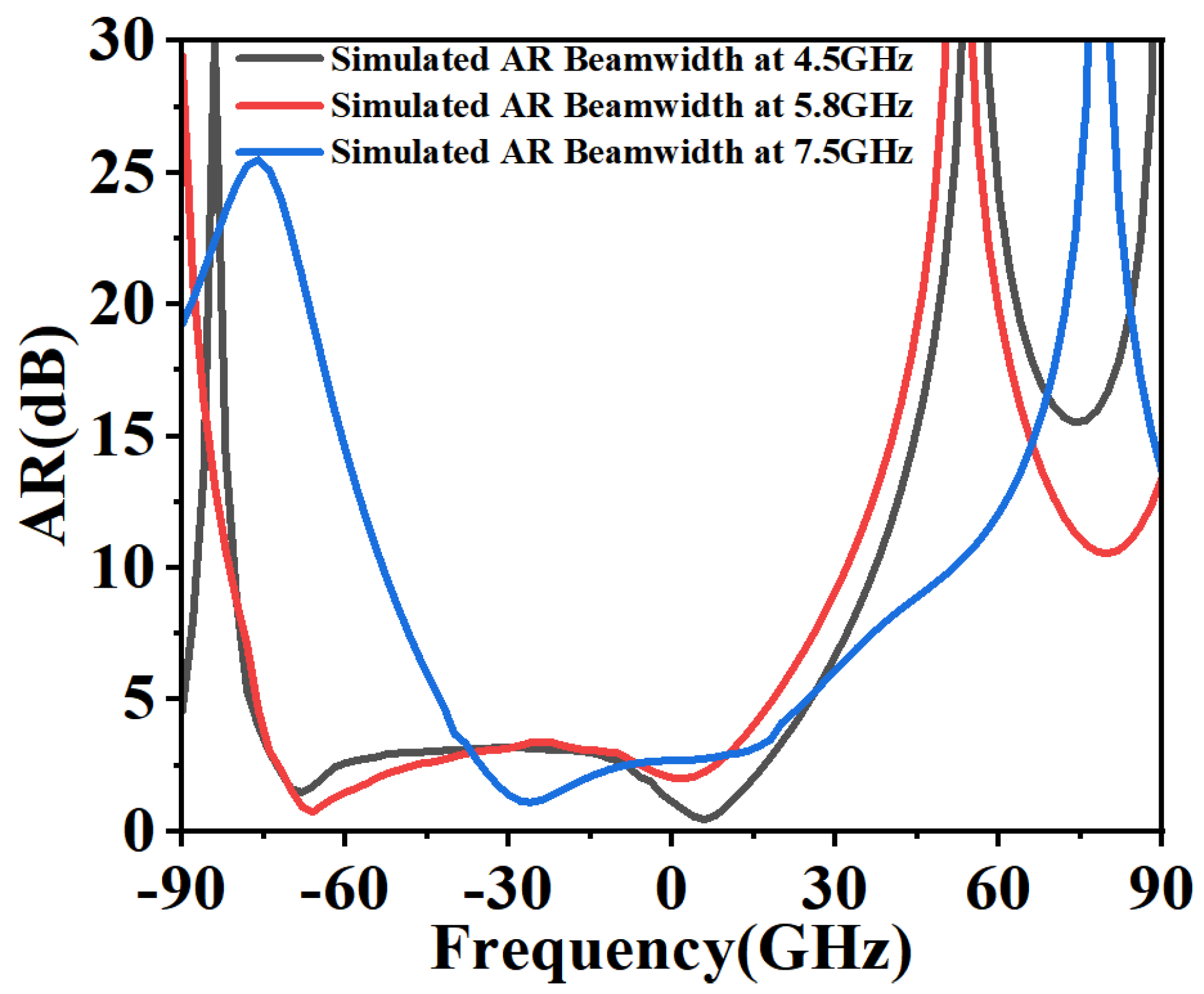 Figure 12. Axial ratio beamwidth for RHCP at 4.5 GHz, 5.8 GHz, and 7.5 GHz.
