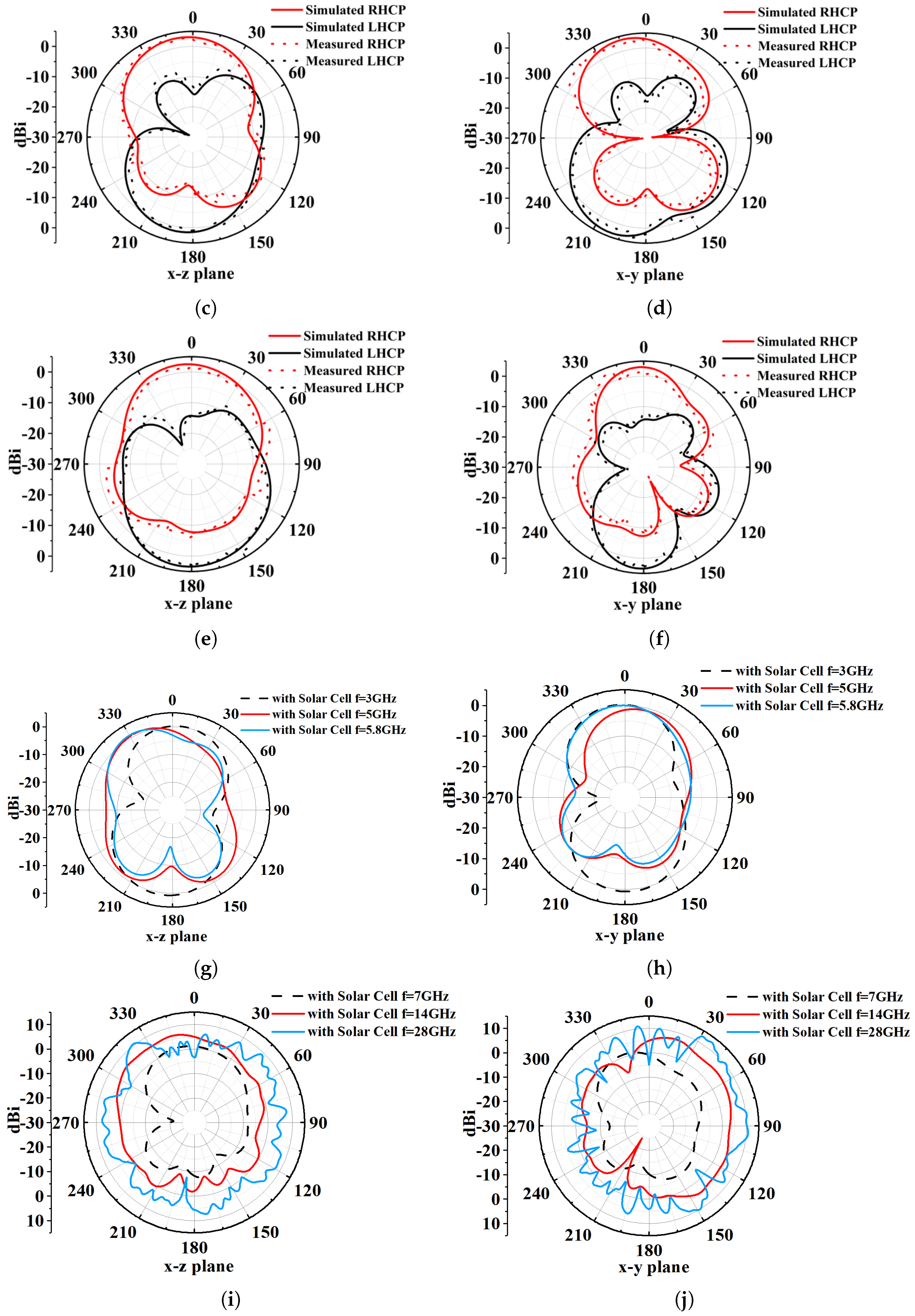 Figure 13. Simulated and measured radiation patterns of antenna (a,b) at 4.5 GHz, (c,d) at 5.8 GHz, and (e,f) at 7.5 GHz; (g,h) with solar cell at 3 GHz, 5 GHz, and 5.8 GHz; and (i,j) with solar cell at 7 GHz, 14 GHz, and 28 GHz.