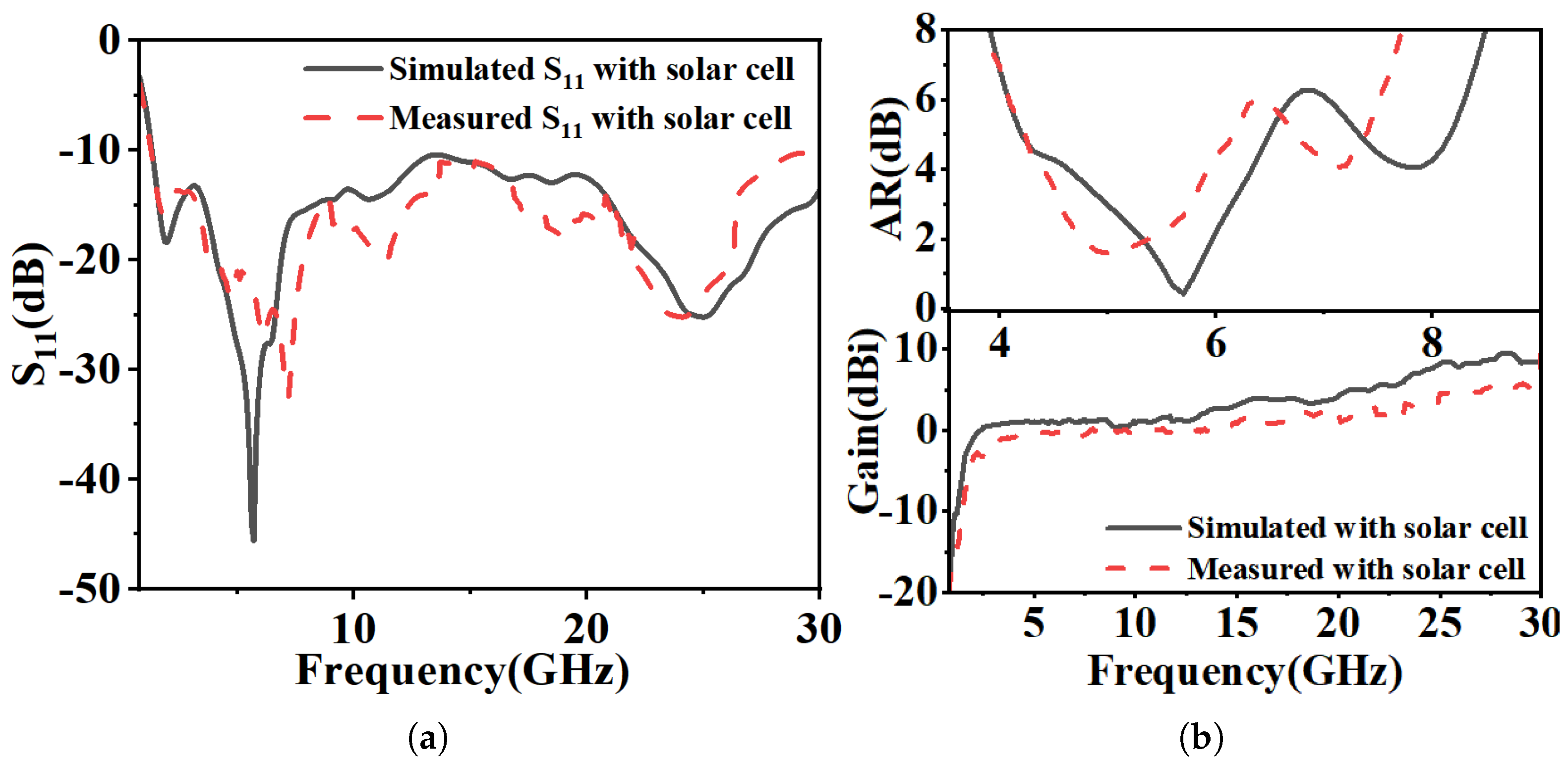 As shown in Figure 9b, the solar cell acts as a parasitic element, perturbing the antenna’s surface current distribution upon integration. This perturbation disrupts the critical amplitude and phase balance of the orthogonal modes, degrading the circular polarization purity and narrowing the axial ratio bandwidth. Concurrently, the solar cell absorbs radiative energy, leading to a slight reduction in gain, as evidenced by the peak gain of 6.31 dBi in its presence.