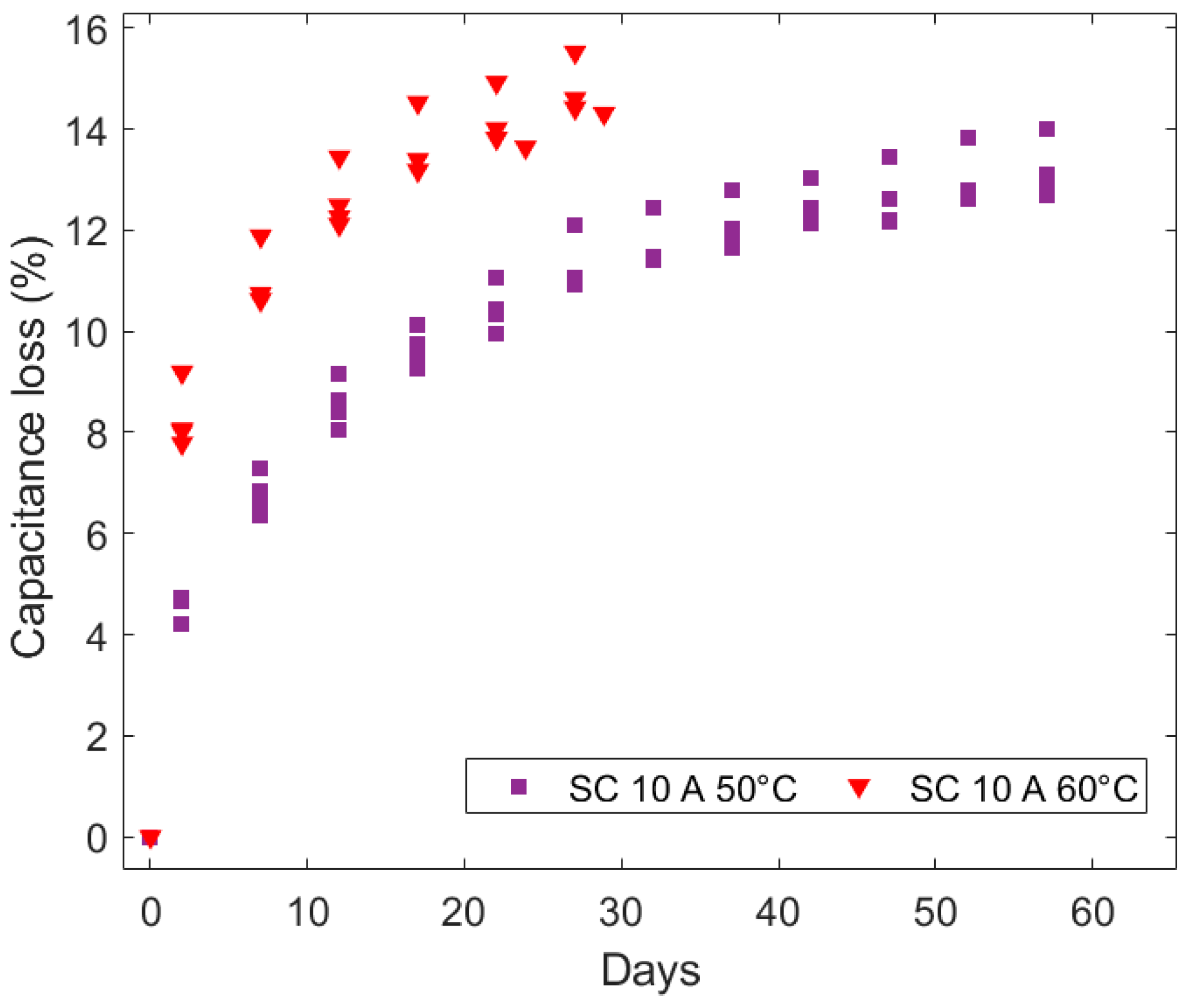 - German, R.; Sari, A.; Venet, P.; Zitouni, Y.; Briat, O.; Vinassa, J.-M. Ageing Law for Supercapacitors Floating Ageing. In Proceedings of the 2014 IEEE 23rd International Symposium on Industrial Electronics (ISIE), Istanbul, Turkey, 1–4 June 2014; IEEE: New York, NY, USA, 2014; pp. 1773–1777. [Google Scholar] [CrossRef]