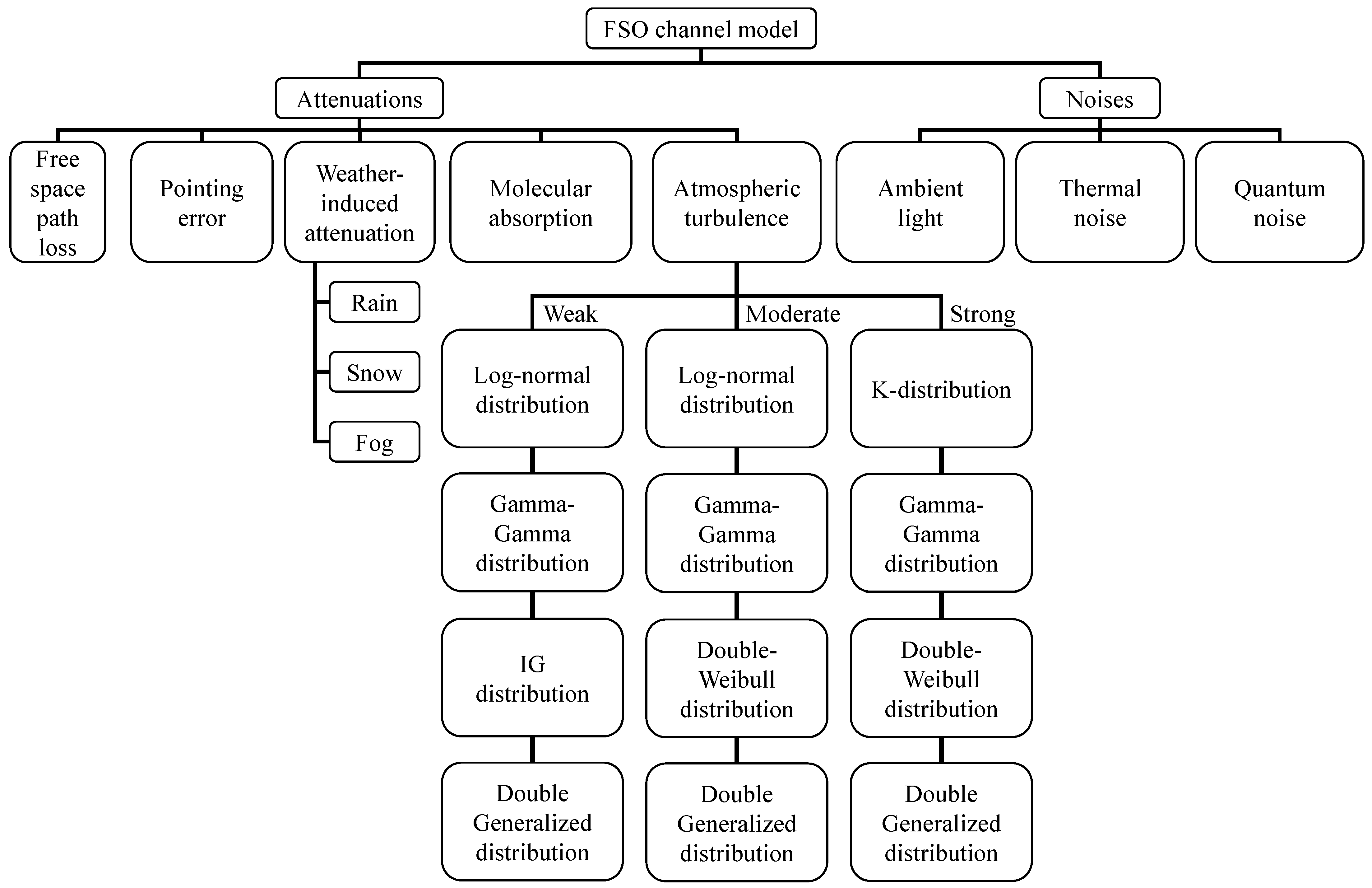- Khan, A.N.; Saeed, S.; Naeem, Y.; Zubair, M.; Massoud, Y.; Younis, U. Atmospheric turbulence and fog attenuation effects in controlled environment FSO communication links. IEEE Photonics Technol. Lett. 2022, 34, 1341–1344. [Google Scholar] [CrossRef]