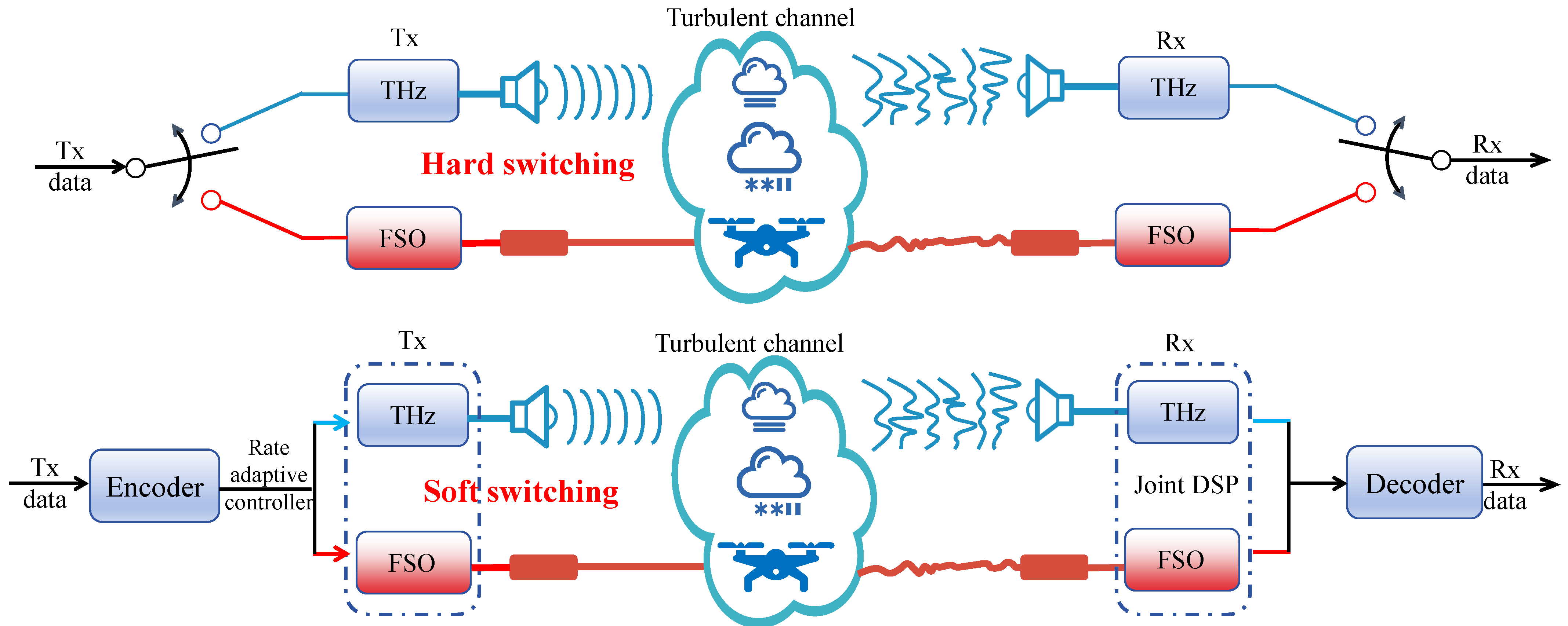 - Gao, W.; Liu, K.; Han, C.; Chen, Z. Seamless Gbps Hybrid FSO/THz Communication With Intelligent Switching. J. Light. Technol. 2025, 43, 9079–9089. [Google Scholar] [CrossRef]