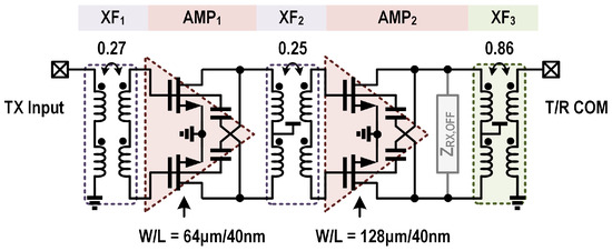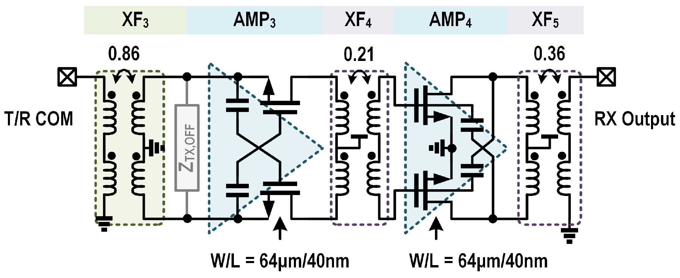 Figure 4 shows a detailed schematic of the proposed T/R amplifier. It consists of the TX and RX channels, each containing two amplification stages. The output side of the TX and the input side of the RX amplification cores are connected together and share the same matching network to the T/R common port. The common matching network is accomplished by a two-coil transformer XF3. The implementations of the TX and RX channels in the T/R amplifier are detailed in the following Section 3.