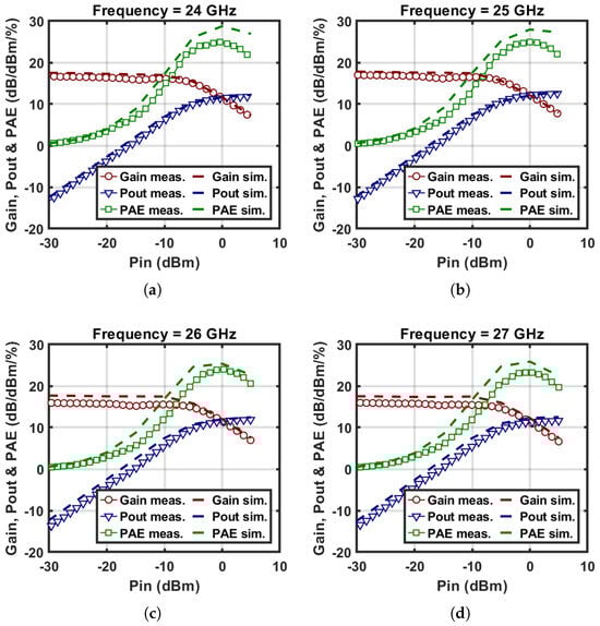 Measured and simulated power gain, output power, and PAE versus input power at the frequencies of (a) 24 GHz, (b) 25 GHz, (c) 26 GHz and (d) 27 GHz.