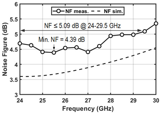In Figure 16, the measured NF of the RX channel is shown. The minimum NF of 4.39 dB is achieved at 25.5 GHz and the NF remains less than 5.09 dB across the 24–29.5 GHz band.