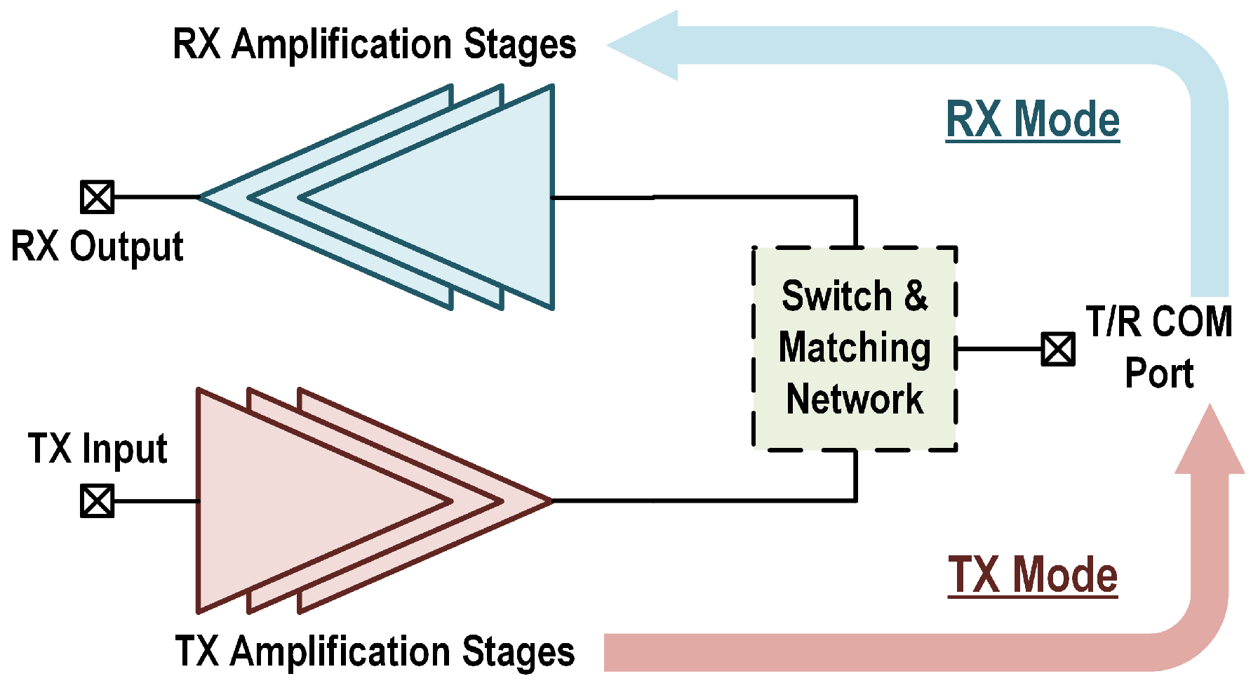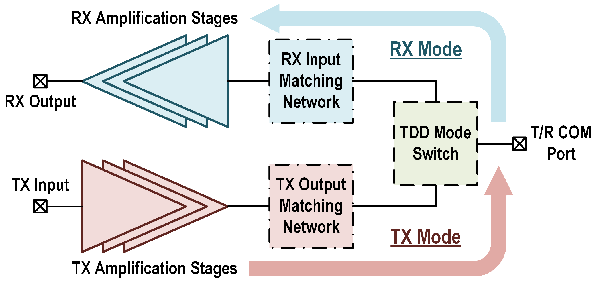 Figure 1. Full T/R amplifier topology for TDD applications, including the amplification stages, matching networks, and TDD mode switch.