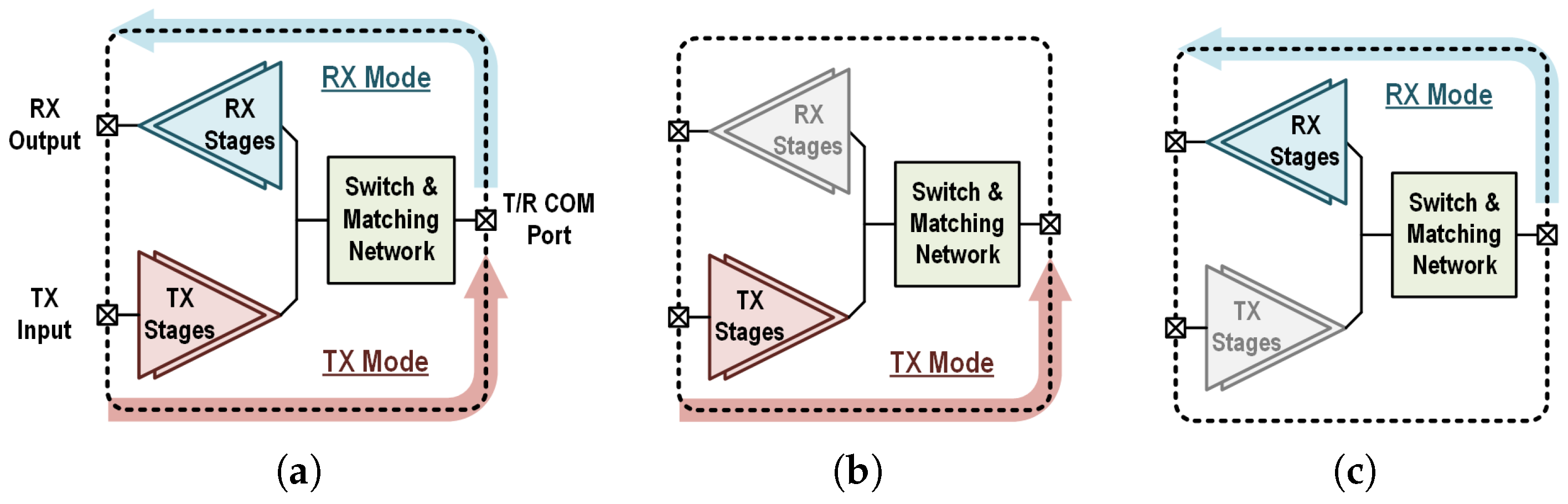 The architecture of the T/R amplifier in this work is demonstrated in Figure 3a. The switch and matching network itself has two ports, which are connected to the external T/R common port and the internal TX and RX common nodes. The RX branch is turned off in TX mode and the TX branch is turned off in RX mode, as shown in Figure 3b,c. Fully combining the switching and matching functions, this topology represents a unique case of the hybrid network shown in Figure 2.