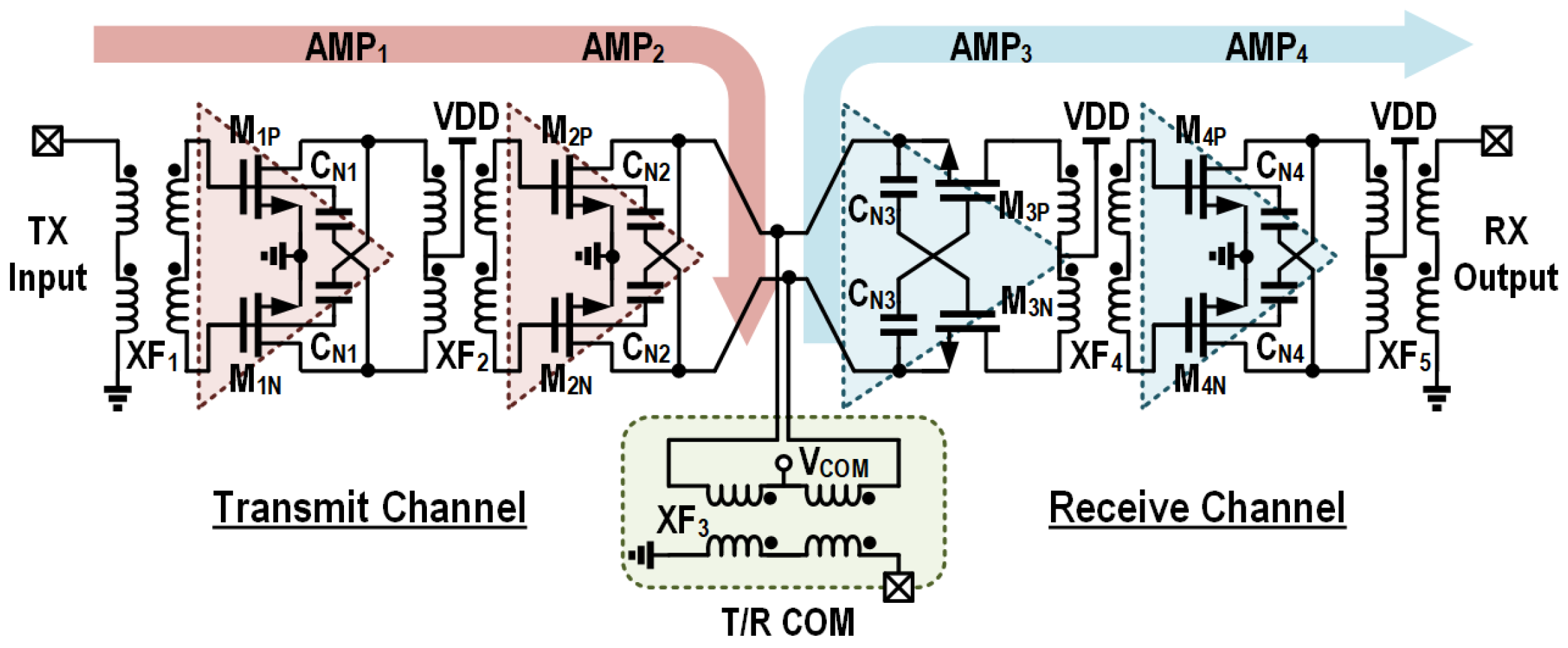Time-division duplex (TDD) transmission represents one of the most prevalent duplexing strategies, finding broad utility in applications such as millimeter-wave (mm-Wave) 5G communication networks, radar and imaging systems [1,2,3,4,5,6,7,8,9,10,11]. The realization of TDD operation in these systems requires the incorporation of transmit (TX) and receive (RX) modes together with the embedded mode switching capabilities. In contrast to standalone TX or RX designs [12,13,14,15,16], the integration of an additional switch element increases the design complexity of the TDD transceiver (TRX).