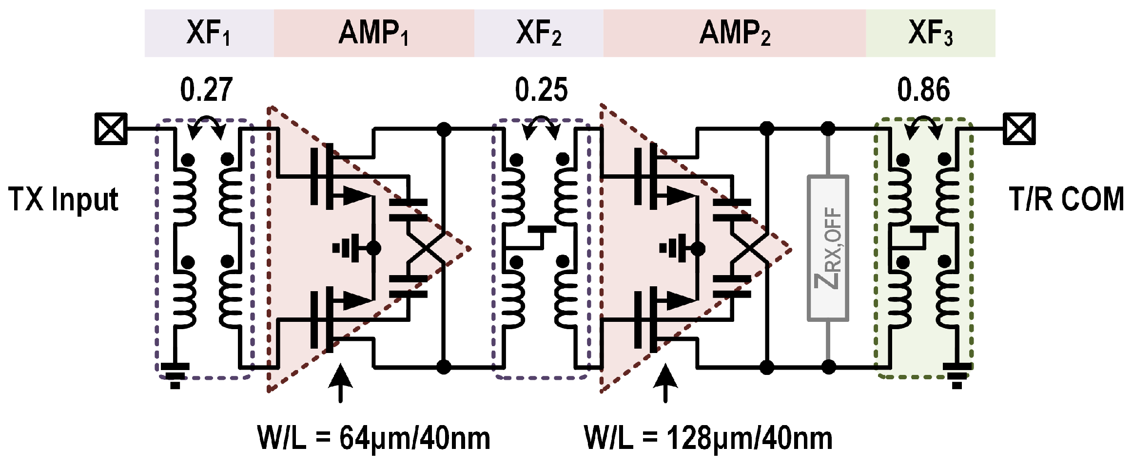The TX channel is composed of two capacitive neutralized CS amplification stages (i.e., AMP1 and AMP2) and three transformer-based matching networks (i.e., XF1, XF2 and XF3), as depicted in Figure 5. The power stage has a width of 128 μ m to provide over 10 dBm output power with a reasonable margin, and the driver stage has a width of 64 μ m for sufficient driving capabilities and improved efficiency of the TX channel. The adopted two-stage amplification topology ensures a reasonably high gain for the TX chain, which relaxes the driving capabilities required from the external TX stages.