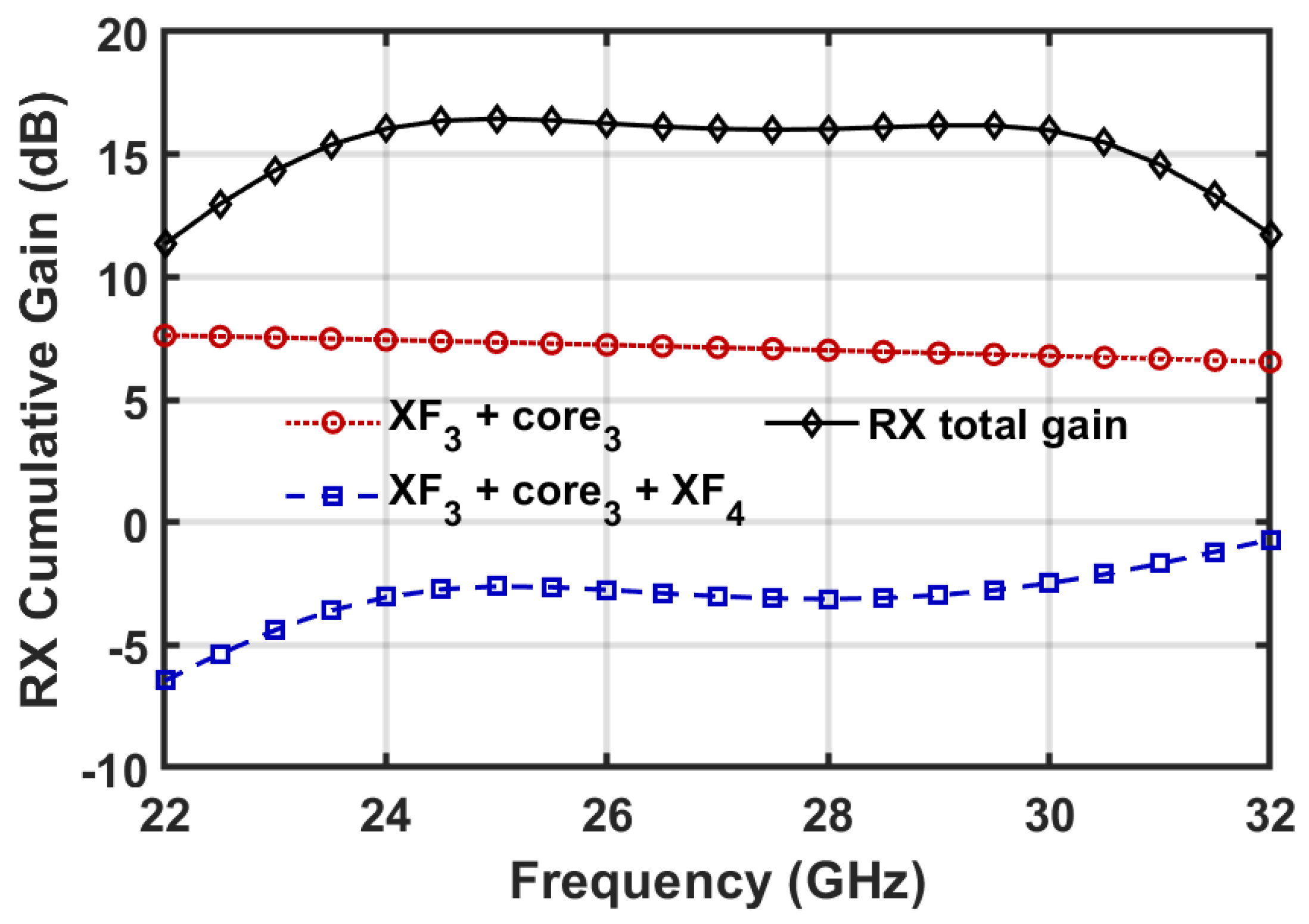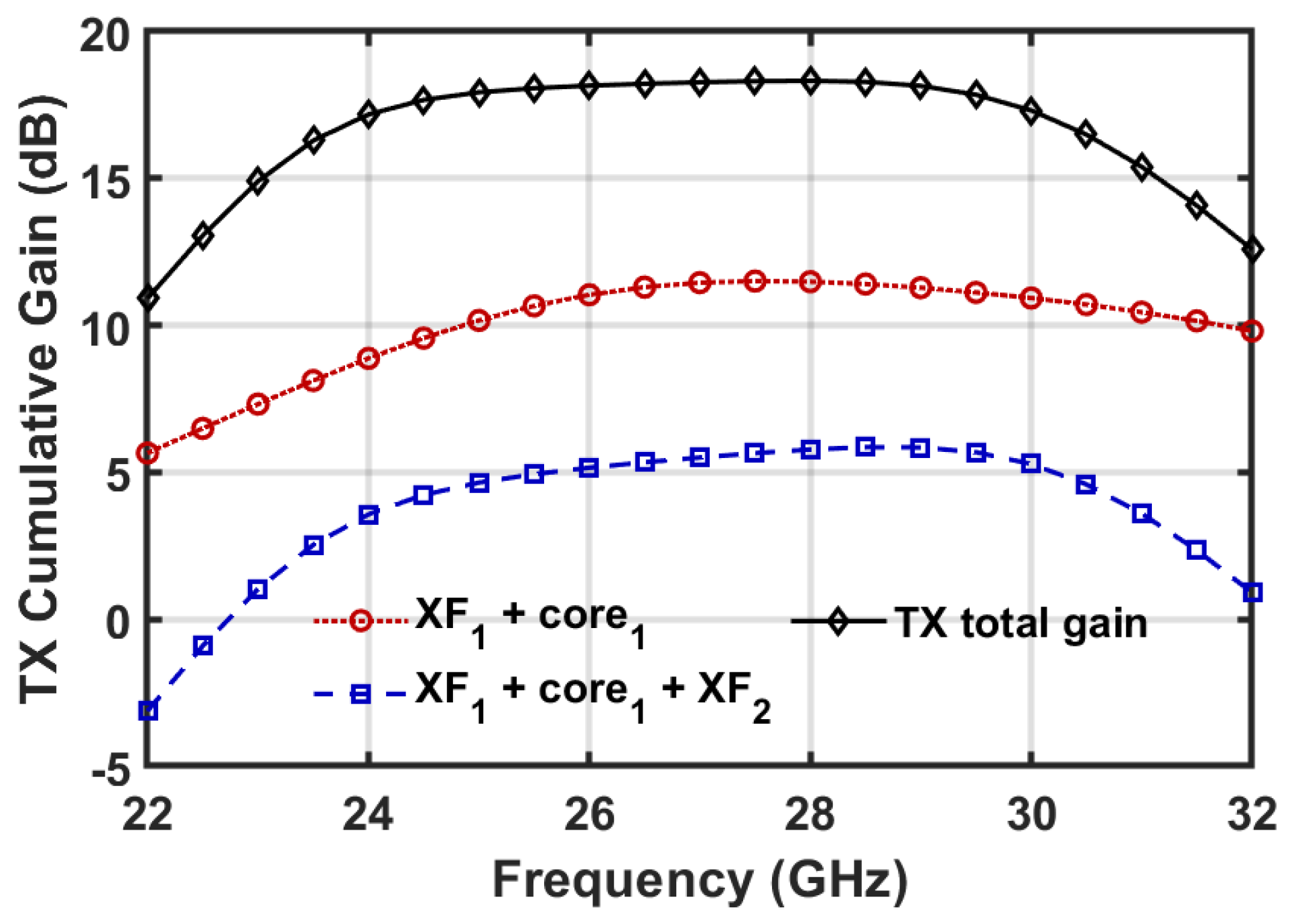 The collaborative operation of the three transformer-based impedance matching networks in the TX channel ensures a flat gain response across the target frequency band. In the TX channel, the XF3 transformer is first designed to transfer the optimal impedance—determined by jointly considering the TX power and RX noise simulations—to the external load (as detailed in Section 3.3), while the other two transformers are subsequently optimized to flatten the overall gain response. Figure 6 shows the simulated cumulative gain of the TX channel, which demonstrates the cooperative behavior of the matching transformers in achieving a flat gain response. Considering the high-Q resonating tank introduced by the input impedance of the CS amplification cores, the input and interstage transformers XF1 and XF2 have low coupling coefficients of 0.27 and 0.25, to achieve wideband impedance matching. In addition, XF1 and XF2 also serve to suppress the gain at the low-frequency side to compensate for the high-frequency gain roll-off introduced by the amplification cores. Ultimately, the TX channel achieves a flat overall gain across the 24–30 GHz frequency band, as shown in Figure 6.