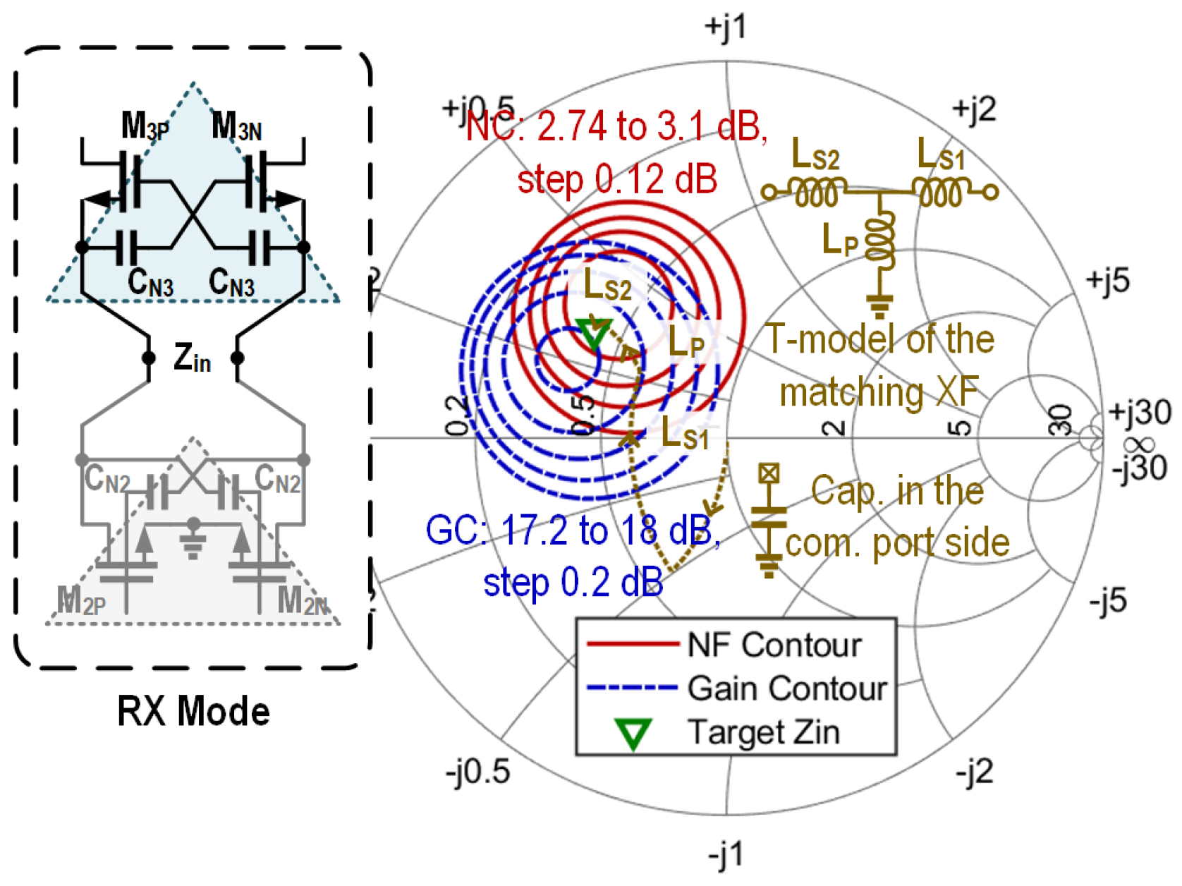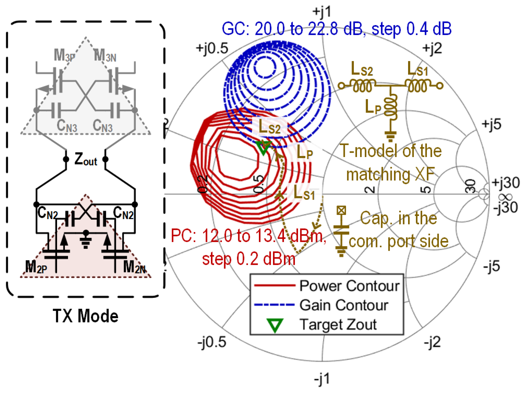 In TX mode, the RX path is turned off and presents relatively high input impedance to the connected node of the TX and RX amplification cores. The TX-to-RX leakage causes an approximately 0.4 dB decrease in output power. Similarly, in RX mode, the RX-to-TX leakage degrades the minimum NF by approximately 0.4 dB. In Figure 9, the simulated power contours and gain contours of the TX channel are depicted. Figure 10 shows the simulated noise figure contours and gain contours of the RX channel. Based on Figure 9 and Figure 10, the targeted impedances Z o u t and Z i n for TX and RX are determined, which have an identical value of 20.8-j15. This allows good power matching at the TX side and ensures relatively low noise and a high gain on the RX side. The impedance matching trajectory is also illustrated in Figure 9 and Figure 10, which is achieved by the capacitor on the T/R common port side and the transformer XF3. The simulated insertion loss of XF3 is about 1.2 dB. Although the direct connection of AMP2 and AMP3 provides no isolation for the embedded switch, the overall T/R amplifier achieves over 31 dB simulated isolation between the TX input and RX output ports.
