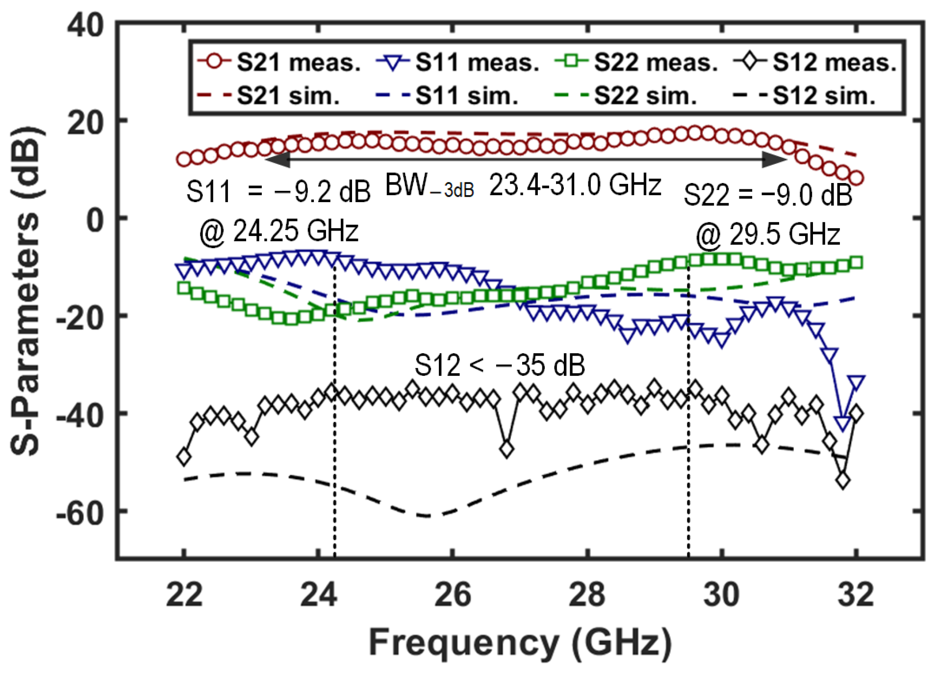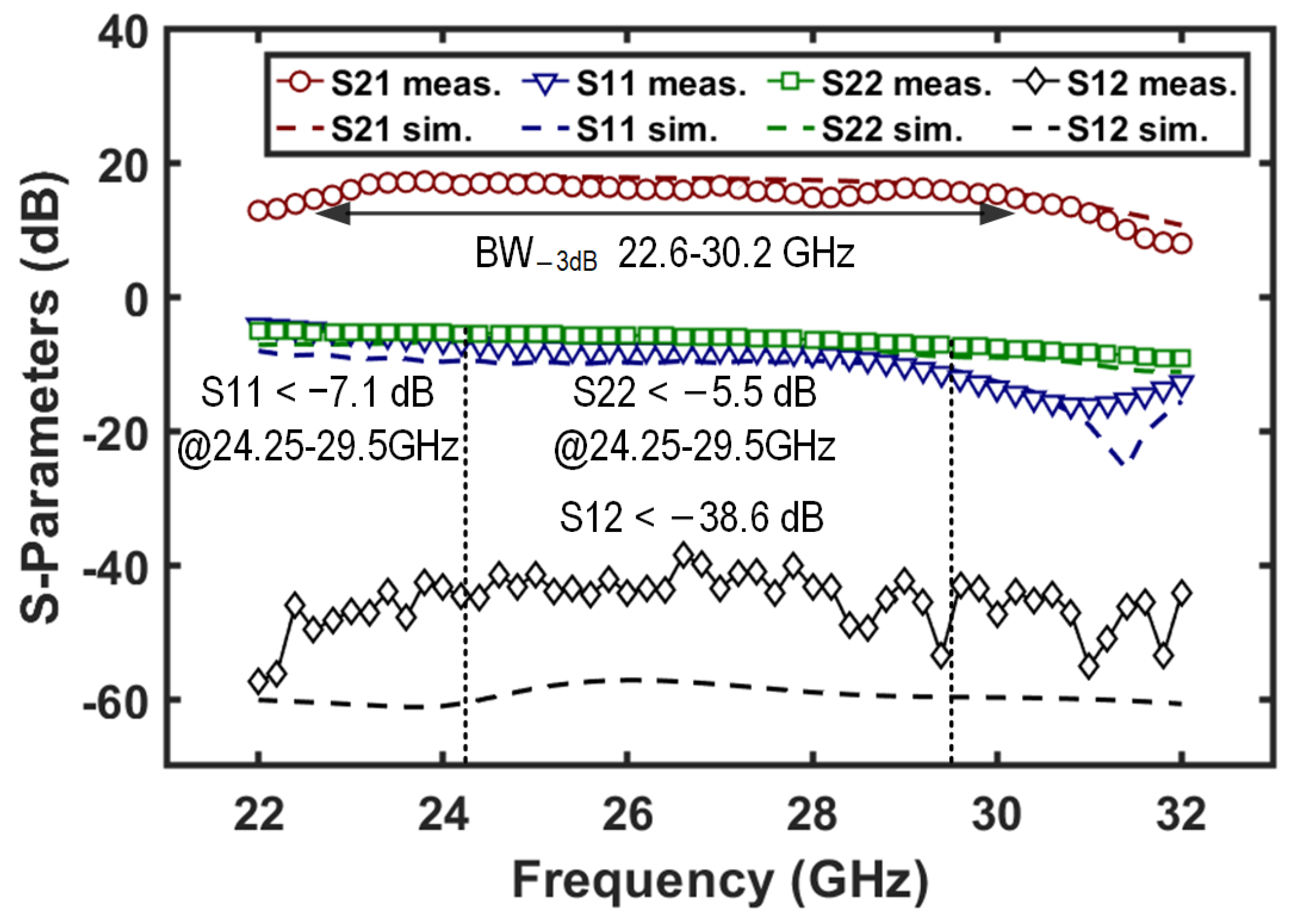 The proof-of-concept T/R amplifier prototype is fabricated in 40 nm bulk CMOS technology and occupies a core area of 0.163 mm2, as shown in Figure 11. The performance of the chip is measured on a high-frequency probe station in both the TX and RX modes.